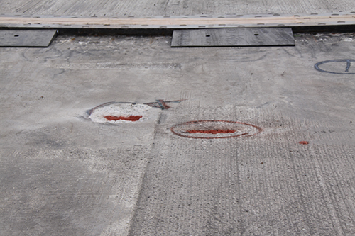 複合床版防水工法の施工(左)、床版上面の部分的な損傷(右)