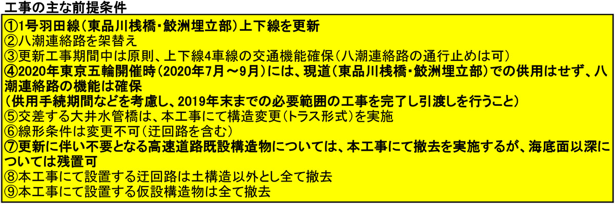 同工事の設計・施工延長は約1,900㍍(土工部約600㍍、高架部約1,300㍍)で全区間を一括発注する予定。工期は平成38年9月30日までを基準とする。更新に際しては道路の幅員を現状の17㍍から18.2㍍に広げるとともに、並行する東京モノレールからの一定の離隔の確保、桁下クリアランスを現状よりも大きくとることで将来の維持管理性を確保する。また、工事の計画立案にあたっては9つの前提条件(表①)を付けている、制約条件が列挙される中、既設構造物の海底面以深については残置可としており、撤去作業の軽減に大きく寄与する。