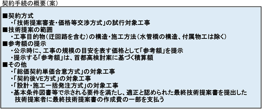 契約方式は「技術提案審査・価格等交渉方式」の試行対象工事として発注される(詳細は表②)。来年1月下旬から手続きを開始、7月上旬に契約を締結し、単価協議の上、8月上旬には単価合意書を締結する予定。要求する技術提案の範囲は、迂回路をを含む工事目的物の構造・施工方法、但し水管橋の構造、付属物工は除く)