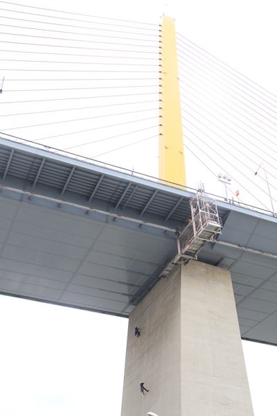 阪神高速道路特殊高所技術はタイ高速道路公社(EXAT:Expressway Authority of Thailand)と共同で、特殊高所技術(足場を用いることなく橋梁や構造物にロープでぶら下がり、上下左右に移動し、クラック調査、写真撮影、耐久性等に関する調査、点検、施工を可能にする技術)をタイ国内での高速道路等の保全に役立てることが可能かどうかについて検討を進めている。