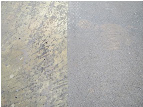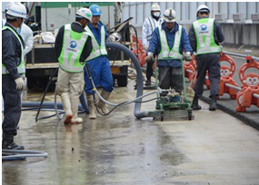 同工区は現在高性能床版防水として使用されているウレタン系防水工の最初期である平成14年頃に施工した個所であるが、防水層の接着不良などから舗装にポットホールなどの損傷が繰返し生じたため、一部で舗装の打ち替えに至ったもの。その際、床版防水工まで施工しなおさなければならないが、従来のライナックスやショットブラストによる施工では既設の床版プライマーを完全に除去することが難しかった。そのためWJを採用した結果、1台あたり平均300~500平方㍍/日の効率で除去することができた。