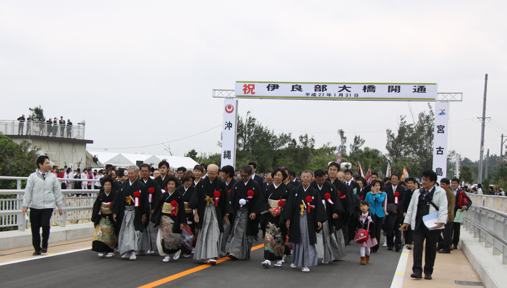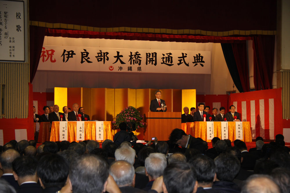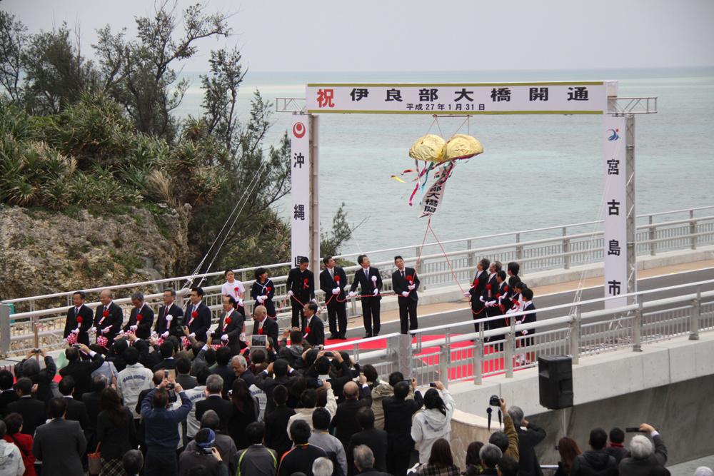 翁長雄志沖縄県知事は開通式の式辞の中で、「伊良部大橋の建設は離島の隔絶性を解消し、地域の振興を図るため、昭和49年に当時の伊良部村からの架橋要請を皮切りに国や県に要請行動が展開され、平成13年度に事業化に向けた着工準備調査が開始された。本格的な橋梁工事は平成17年度から進められ、10年の歳月を経て本日めでたく開通の運びとなった。伊良部大橋は本県の21番目に完成した離島架橋であり、橋長3,540㍍は通行料を徴収しない橋としては日本一の長い橋である」と述べた。