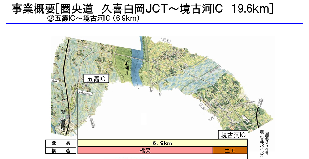同区間は国道、県道、新幹線など交差交通が多いことからNEXCOが担当する境古河ICから西側の盛土区間を除いた約8割を高架・橋梁が占める。また、軟弱地盤のため高架・橋梁は全て鋼橋で二主鈑桁、またはスレンダーボックスが大半を占める。床版形式は全て合成床版である。同区間最長の橋梁は利根川渡河部に架設された圏央利根川橋(約1,300㍍)。鋼桁の架設は基本的にトラッククレーン+ベントで施工するが、圏央利根川橋は送り出し、国道4号線との交差部は4号線を通行止めして移動多軸台車を用いて施工している。