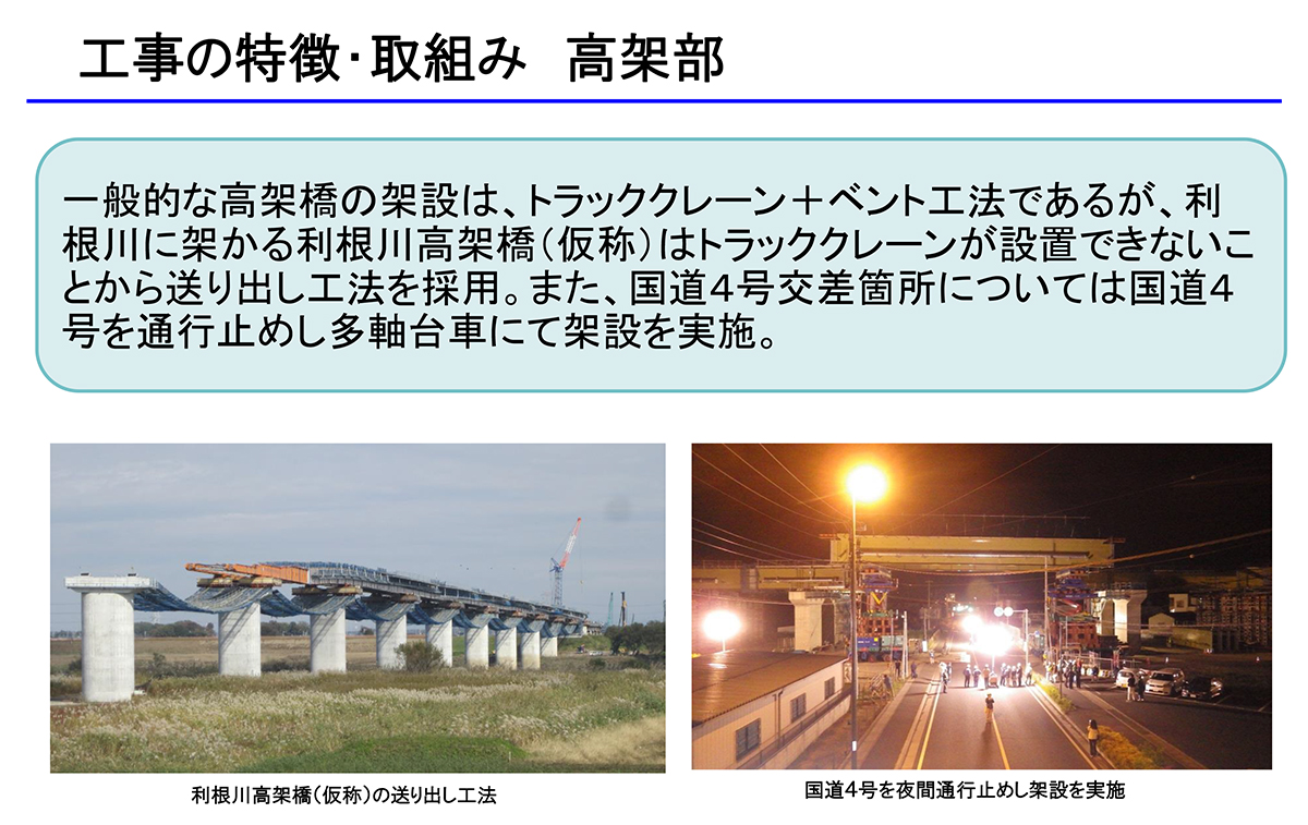 同区間は19.6㌔の延長のうち国土交通省関東地方整備局北首都国道事務所が久喜白岡JCT~利根川西岸700㍍手前と利根川を渡る圏央利根川橋の約15.3㌔の高架・橋梁、NEXCO東日本関東支社さいたま工事事務所が境古河ICから3.6㌔と利根川西岸700㍍の高架・盛土(1.5㌔)区間と構造物の床版防水、舗装、その他付属物の工事を担当した。