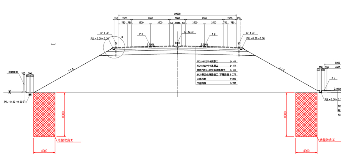 軟弱地盤のため盛土部も盛土法面の下に地盤改良を実施し、地震発生時の液状化の影響を未然に抑止している。特に盛土区間で交差道路用のボックスカルバートを設置する個所では背面部の盛土のCBR(カリフォルニアベアリングレシオ(路床土支持圧力比))を通常の10%からセメント改良することで20%に向上させるとともに、地盤改良緩和区間を延長することで地震発生時の沈下による路面段差量をわずかな変形量に抑制し、復旧を不要にする手法を採用している。