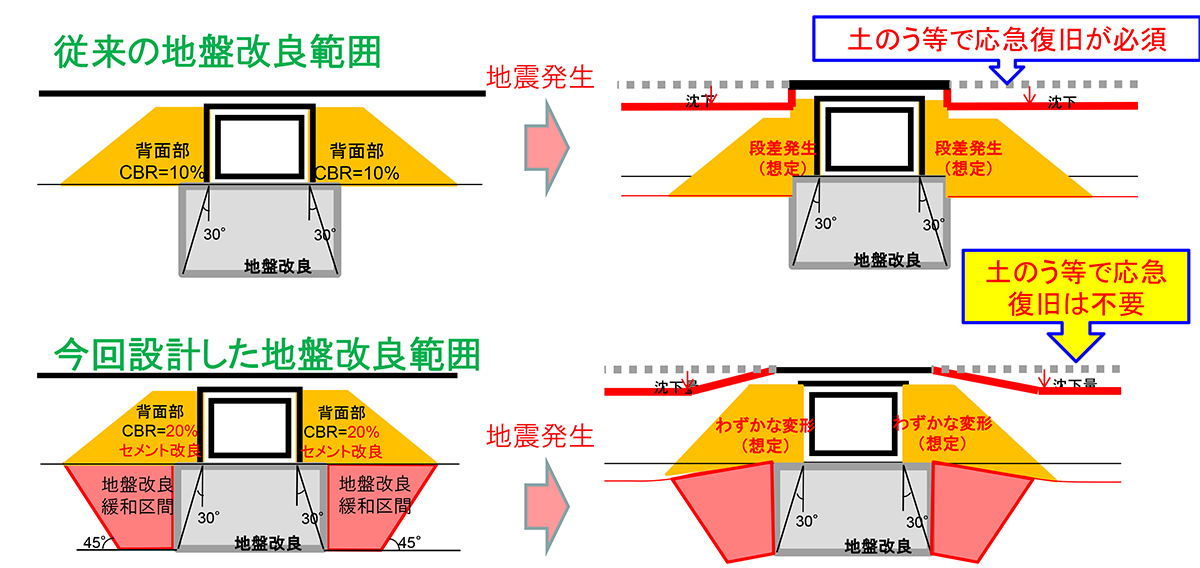 CBRを20%にし、地盤改良区間を延長することで地震時に生じる段差を最小限にする