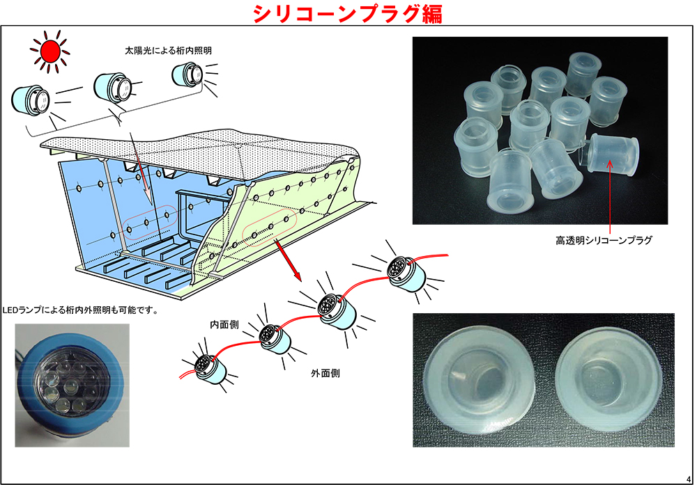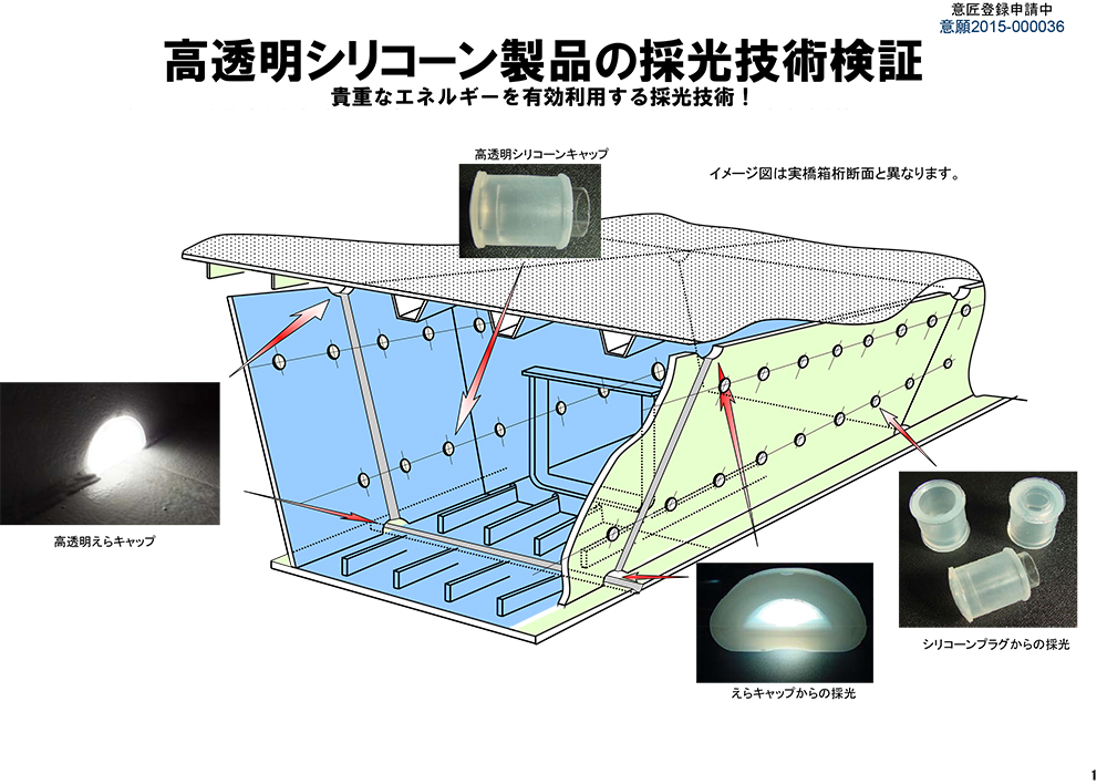 製品は、施工足場用の孔を埋める箇所に使うシリコーンプラグ、鋼桁溶接のスカーラップの孔に差し込むえらキャップを高透明化し、採光できるようにしたもの。足場用の孔は約1㍍ピッチで開けられているため、高透明シリコーンプラグを用いることで箱桁内は非常に明るくなる。またシリコーンゴムは光を拡散させる性質があるため光がさす面積はさらに拡大する。加えてスカーラップを埋めるえらキャップを高透明化することで明るさは増し、点検の際の視認性が現状に比べはるかに向上する。一方で、箱桁内に光を入れることによる(桁内部塗装の)紫外線劣化を防ぐ対策として、紫外線吸収LIMS用シリコーンゴム材料を使用するとしている。