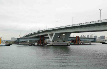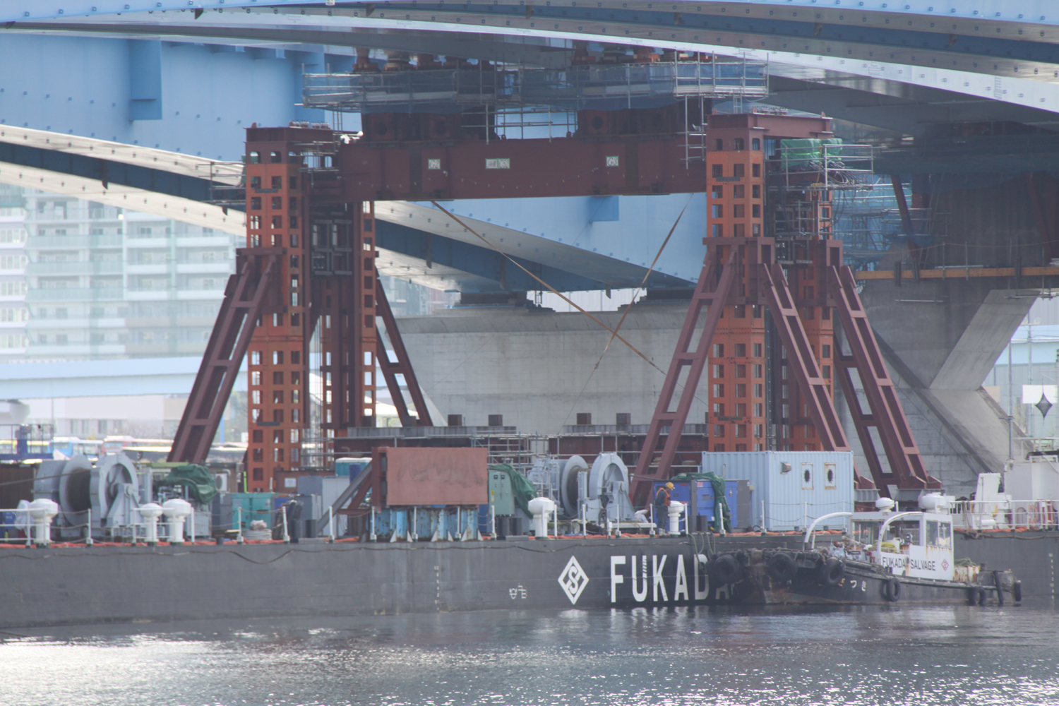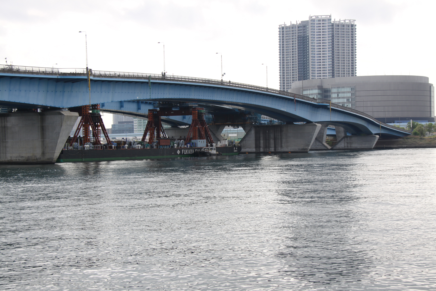 3,000トン吊りFC船を使って浜出し 豊洲大橋の桁下を通過する台船