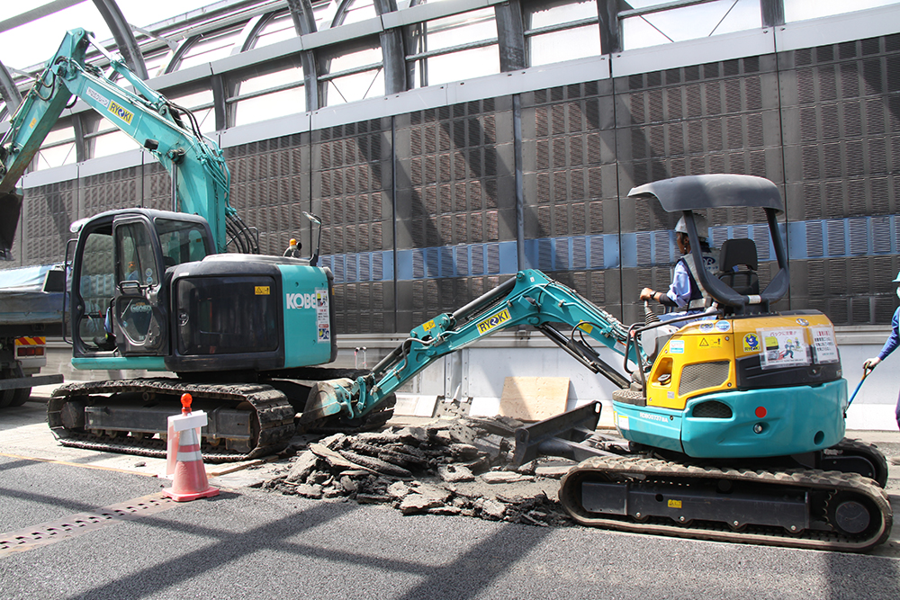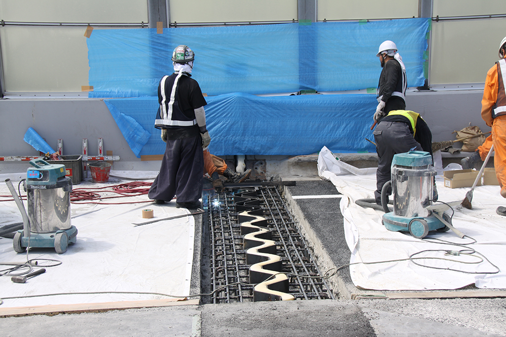 また、伸縮継手の交換だが、撤去については工事騒音を低減するためワイヤーソーを用いた低騒音工法を積極的に採用している。また、舗装との段差が生じることを防ぐために、一旦舗装打ち替え工事でジョイント部も仮埋めした後、改めてジョイント部のみ舗装を除去し、新しいジョイントを据え付け、継ぎ目部分には超速硬コンクリートを打設し、コンクリートを丁寧に舗装と同じ高さになるように均している。