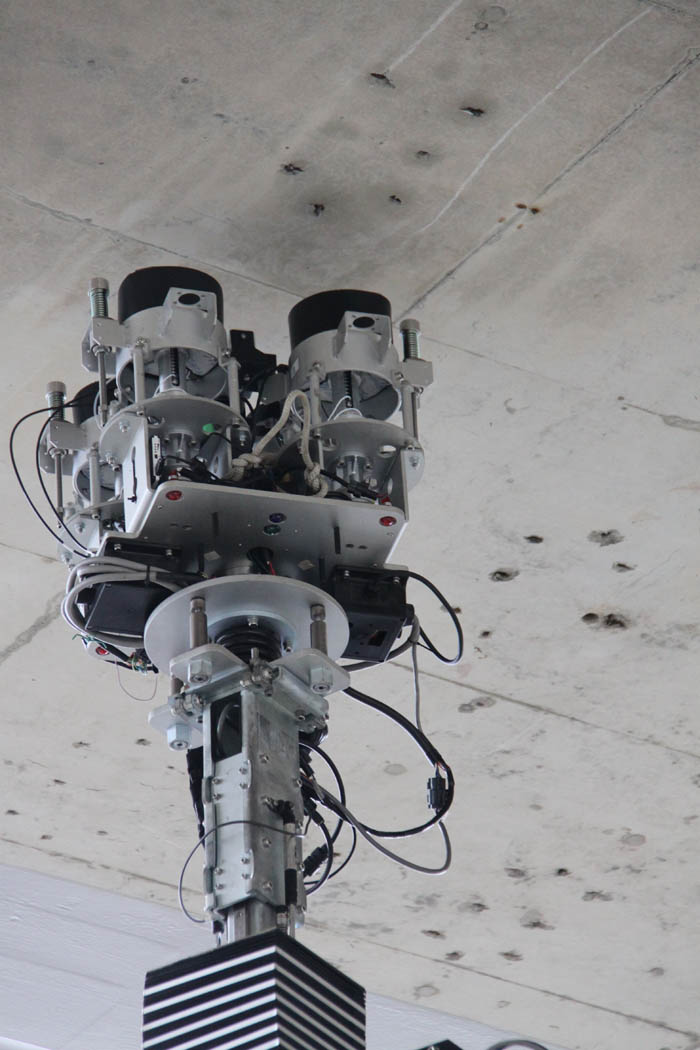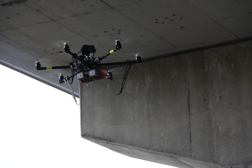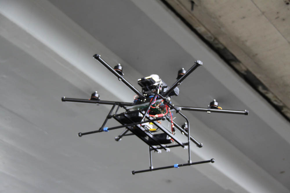昨年度からの継続参加で、前回化の改良点としては、床版裏点検用(上部工法だけSLAMを利かせている)と桁側面点検用(従来機。側面、下部方向にSLAMを利かせている)にそれぞれ専用機を用意している。また、耐風性の向上のため、アーム長さを40㌢延長し、プロペラ径も桁側面点検用のみ330㍉から430㍉に100㍉拡大している。ひび割れ幅は0.1㍉から点検可能で、欠損部などの面積計算もできる。基本的に3㍍程度の離隔で飛行しながら1秒間毎に1ショットの静止画像を撮影(1ショットごとに4×3㍍=12㍍の面積)しており、写真毎のオーバーラップ率は50%程度、5分間で1500~1600平方㍍程度撮影することを可能にしている。