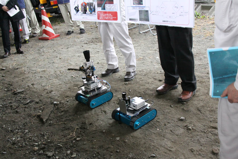 ③は富士フィルムがイクシスリサーチ、(財)首都高速道路技術センターと開発した橋梁近接目視の支援を対象としたシステム。複眼式撮像装置(ステレオカメラ)を搭載したロボットで鋼桁下フランジを移動しながら鋼桁を撮影し、撮影画像を画像処理し「橋梁点検要領等」における損傷を検出して近接目視を主体とする点検の支援および点検調書の作成を支援する。具体的には鋼桁下フランジ懸垂型ロボットに搭載した複眼式撮像装置によって橋梁全体の桁下を移動しながら桁部や床版裏面などの画像を撮影する。撮像装置は障害物を避けて昇降することができる。特に駆動系の改良によって垂直補剛材などの障害物を走破して調査することも可能にしている。加えて、前回よりステレオカメラも改良し、小型化、軽量化を図っている。ステレオ画像を画像処理して損傷の寸法が計測できるため点検および調書作成の費用、手間も削減できる。
