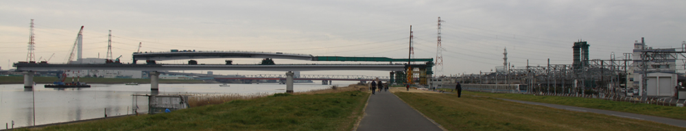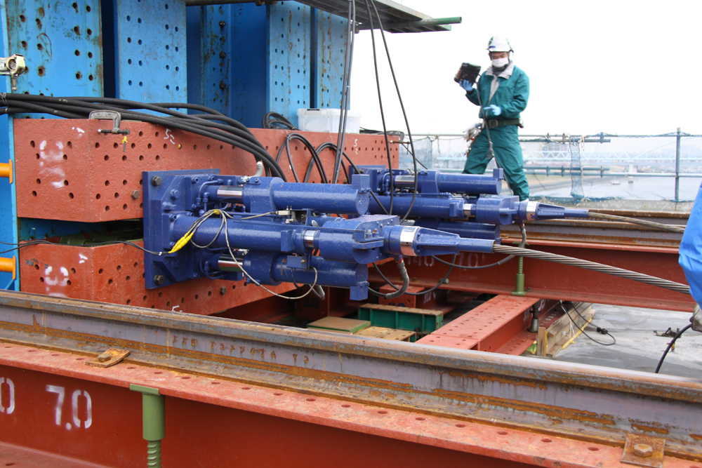 既に架設されている江戸川上のP4~P5桁上に今回架設するP3~P4桁を軌条設備上に地組みし、ダブルツインジャッキという連続運転可能な大型油圧ジャッキおよび1,280㌧台車などを用いることで1分間に1㍍ずつ送り出した。桁重量は手延べ桁(76.5㍍)が約140㌧、本桁(鋼床版箱桁)が680㌧、合計820㌧に及ぶ。