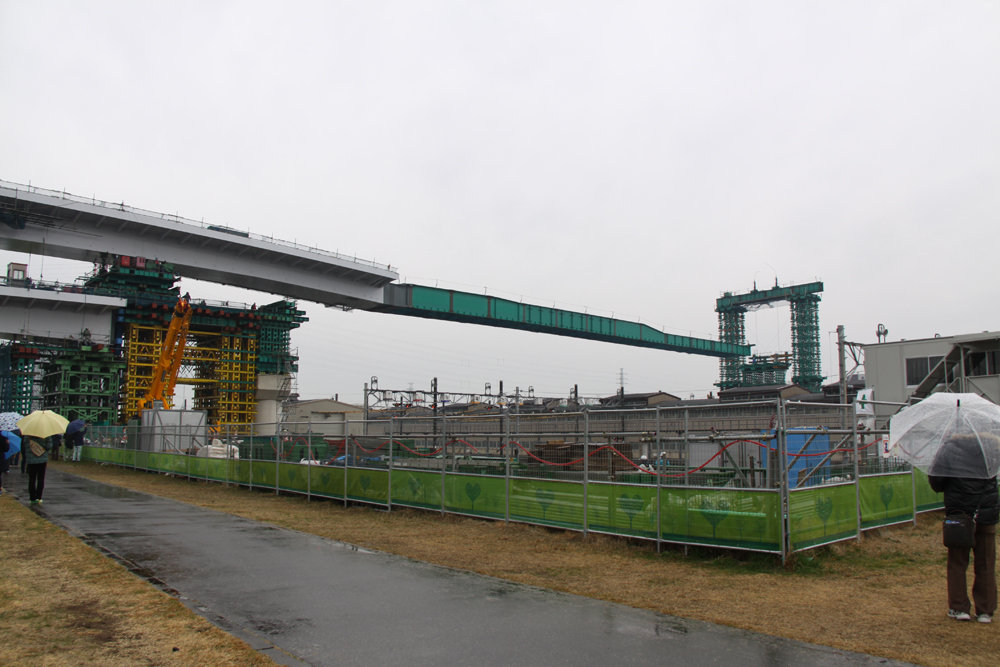 今後は週末ごとに5回に分けて約20㍍ずつ送り出し、手延べ桁を撤去して完了となる。