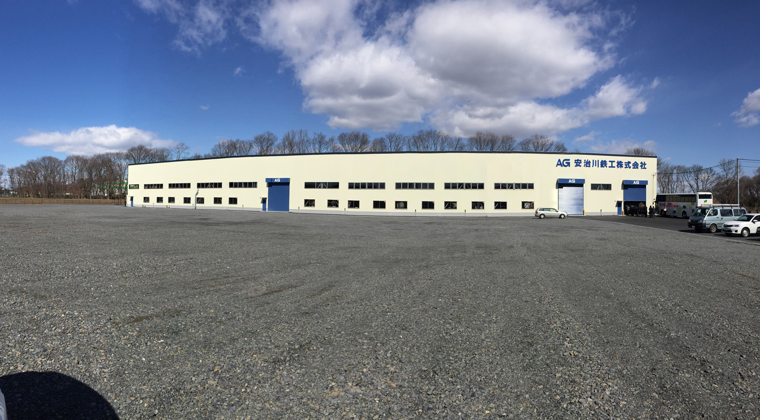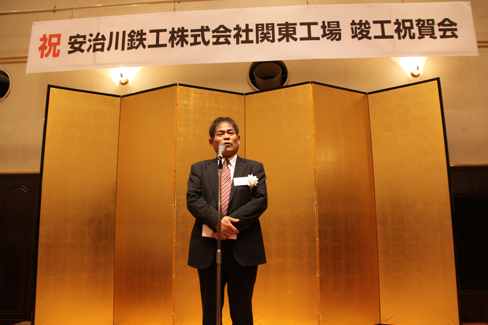 安治川鉄工(吉田秀喜・代表取締役社長)が、主力商品であるエポキシ樹脂塗装鉄筋「AGエポキシバー」の首都圏および東北復興事業などへの拡販を図るため、栃木県小山市に建設を進めていたエポキシ樹脂塗装鉄筋の関東工場(平元英二工場長)が2月末に完成した。1日には、新工場の竣工式(左写真)および完成祝賀会が開催された。敷地面積は12,000平方㍍で建屋面積は約2,000平方㍍。4.8㌧および2.4㌧×2の天井クレーンが1基ずつと、梱包用の門型クレーンが1基配置されている。またエポキシ樹脂塗装工程の諸機械は真新しい最先端の機械が既に稼働していた。生産能力は操業開始時見込みで年産7,200㌧だが、早急にフル操業に近い月産1,500㌧まで引き上げていきたい方針だ。(最大生産は月産3,000㌧可能)また、敷地には余裕があり、仮置き場の拡充や鉄筋以外のエポキシ樹脂粉体塗装を用いた製作ヤードを設けることも念頭に置いている。当初従業員は7人で、その大部分を地元栃木県在住者から採用した。