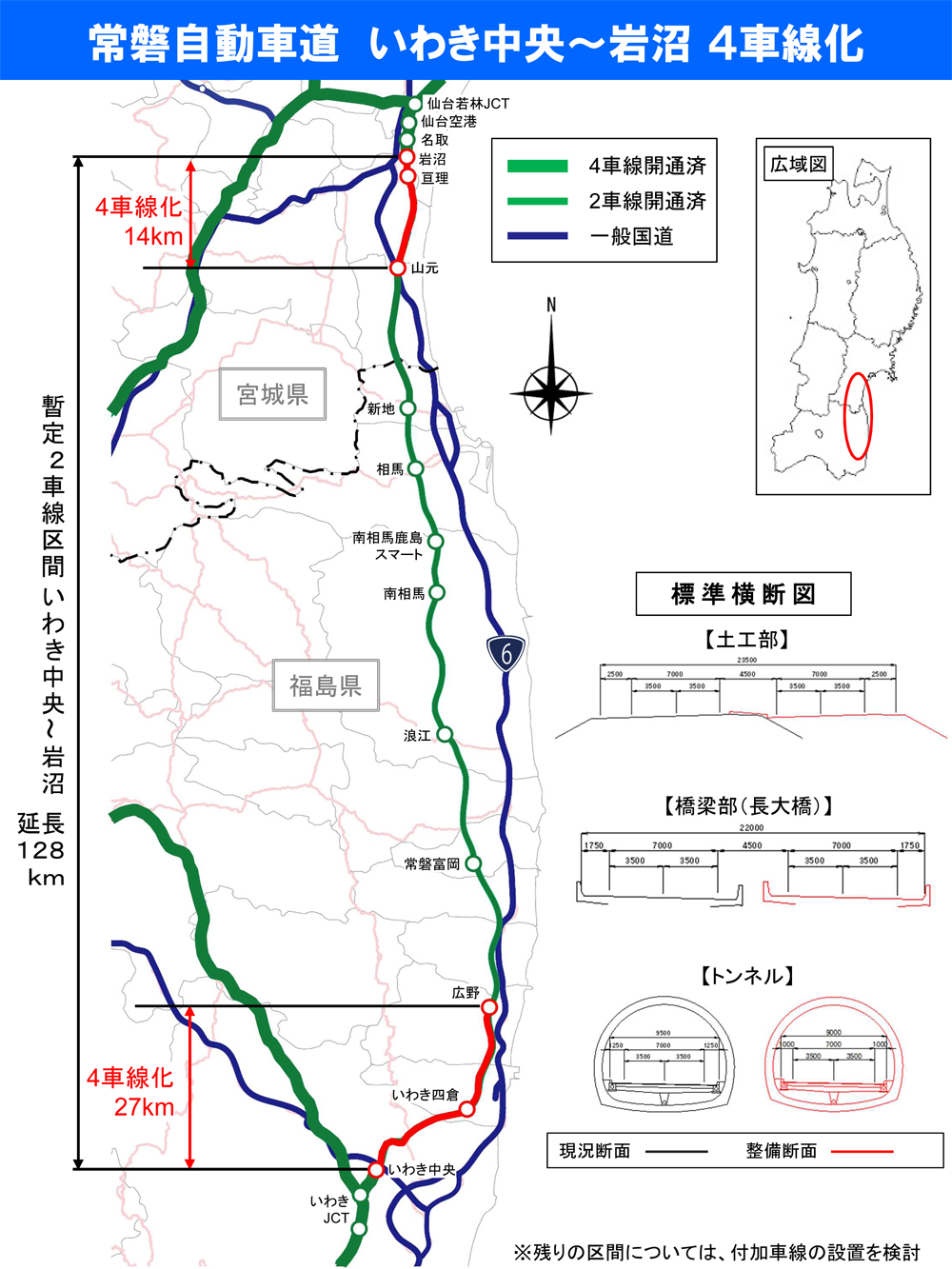 国土交通省は、10日に開催された第15回復興推進会議で常磐道いわき中央IC~広野IC間(延長27㌔)、山元IC~岩沼IC間(延長14㌔)について4車線化に着手することを決めた。概ね5年以内に完成させる方針。暫定2車線分は東日本高速道路が建設し、管理している。