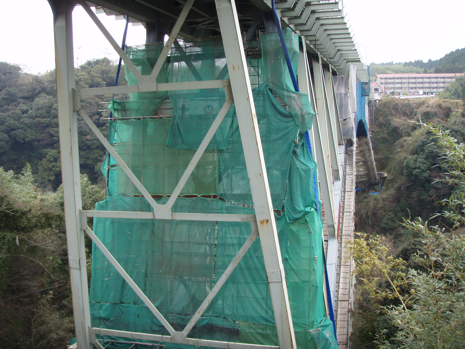 4月16日午前1時半に熊本県阿蘇地方で起きたマグニチュード7.3を記録した地震により、阿蘇大橋(写真は補強前)が崩落した。熊本市方面から南阿蘇村方面に向かう国道325号の黒川渓谷を渡河する箇所に架かる橋長206㍍、鋼トラスド逆ランガー+鋼鈑桁橋。耐震補強は過年度に実施済みだった。内容は、同橋は上路橋のためトップヘビーであることに加え、ランガー橋の両側にはゲルバー桁が配置されているため、地震時変位をいかに抑えるかが課題であった。そこで、トラス部材の一部を減衰部材に交換するとともに、アーチアバット部については上向きの地震動に対する補強を行っていた。