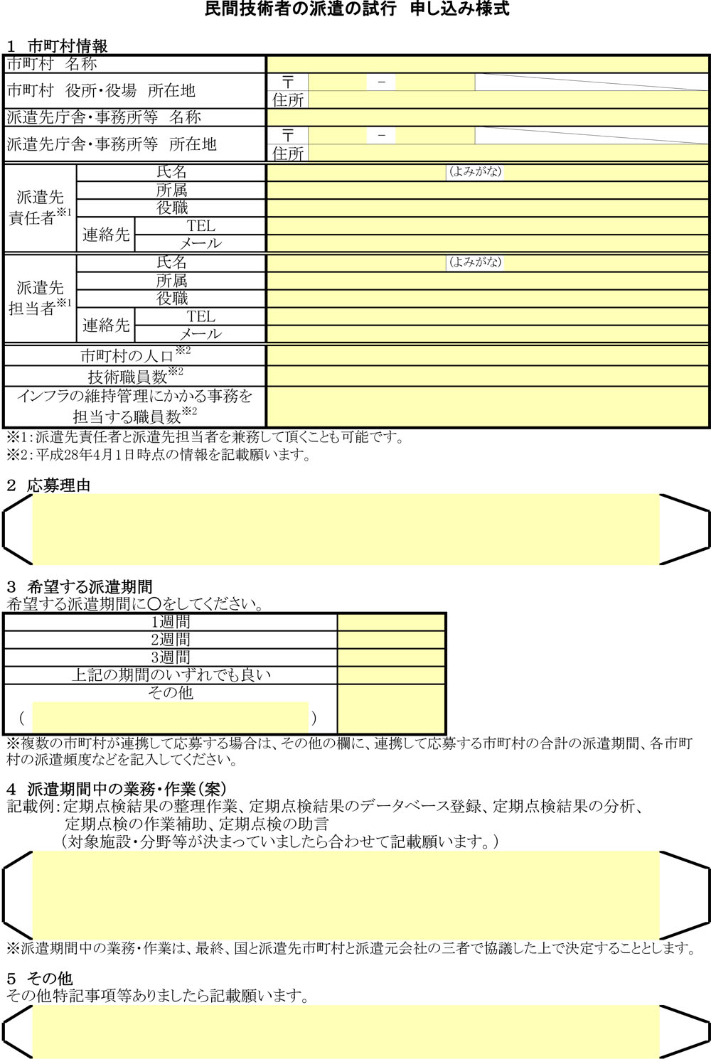 公募(右は申込様式、国土交通省発表資料より)を行い3市町村程度にそれぞれ建設コンサルタント(日本工営)の技術者1名を1~3週間派遣する方針。複数の市町村が広域連携して応募する場合も1市町村としてカウントする。