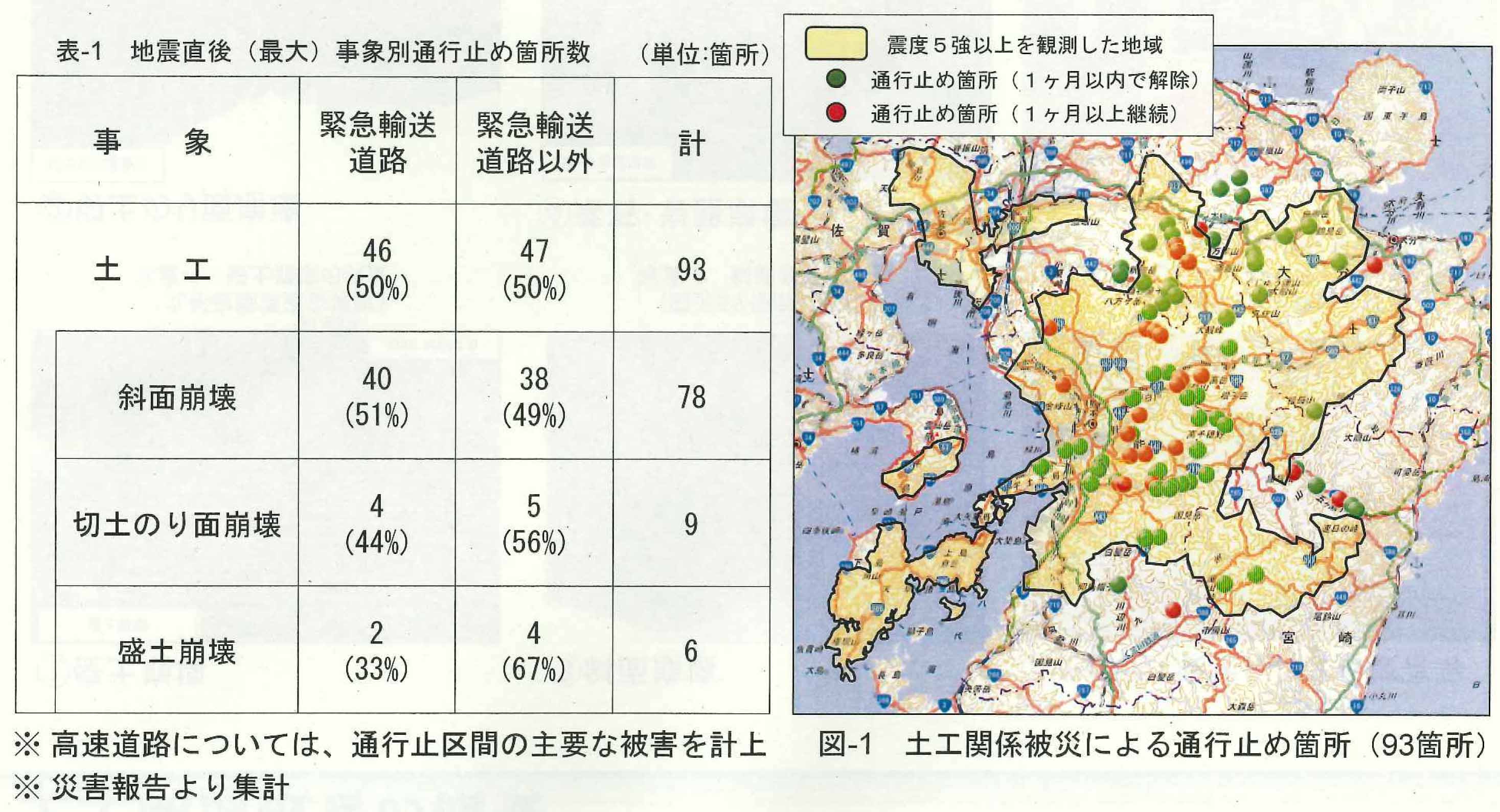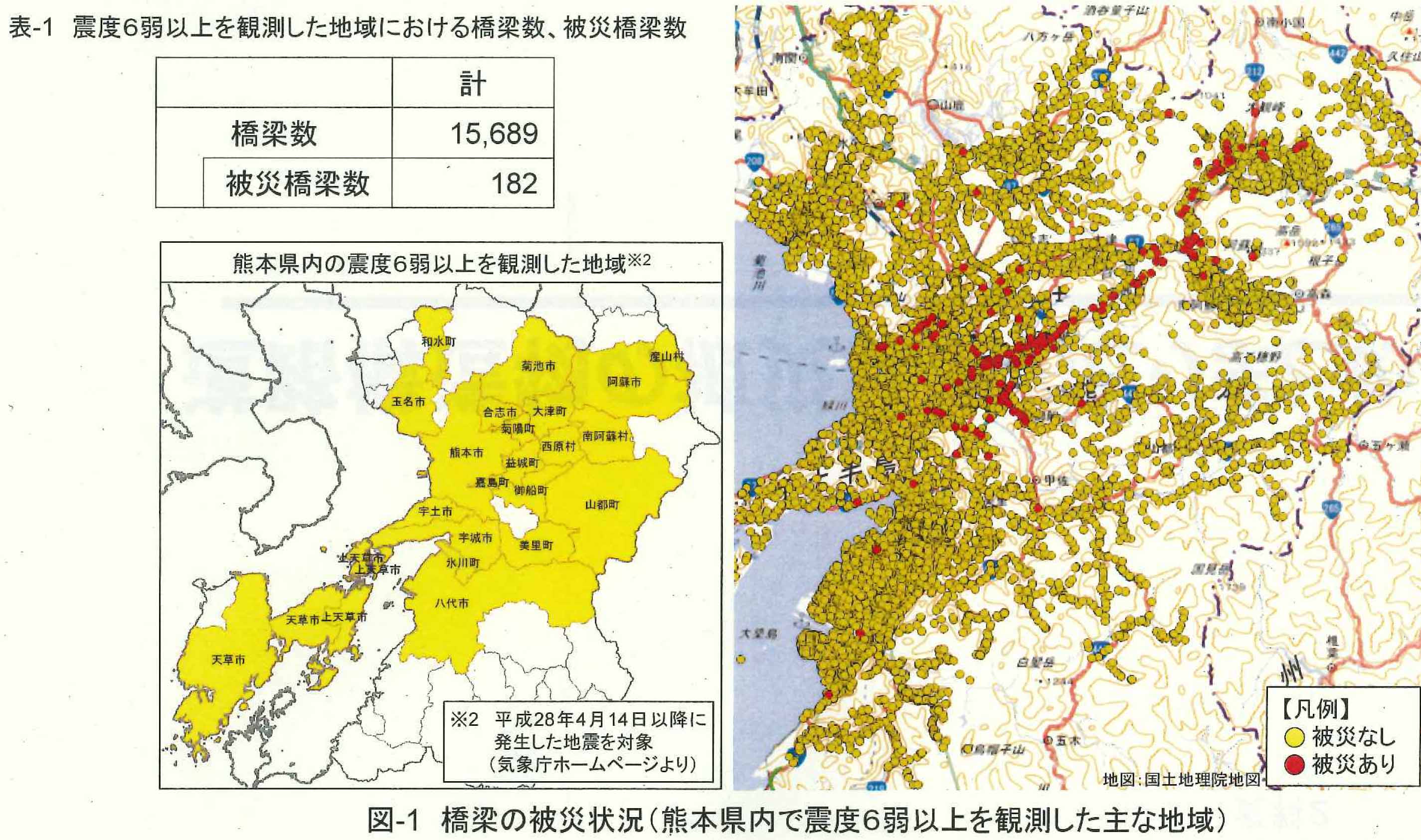 熊本地震による被災は、橋梁182橋(震度6弱以上を観測した地域内約15,700橋のうち)で軽微な被災を被ったが、その殆どが布田川断層近くか阿蘇の外輪山周辺に集中している。また同地域における平成8年道示以降の基準を適用した橋梁は1,250橋あるが被災したのは20橋に留まった。被災した橋梁も落橋・倒壊などはなかった。但し「橋の機能回復が速やかに行い得る」ことが難しい橋梁は4橋あった(桑鶴大橋など)。土工部では震度5強以上を観測した地域を中心に斜面崩壊などが発生し、県道以上の道路のうち93個所で通行止めが生じた。そのうち46個所が緊急輸送道路に該当している。