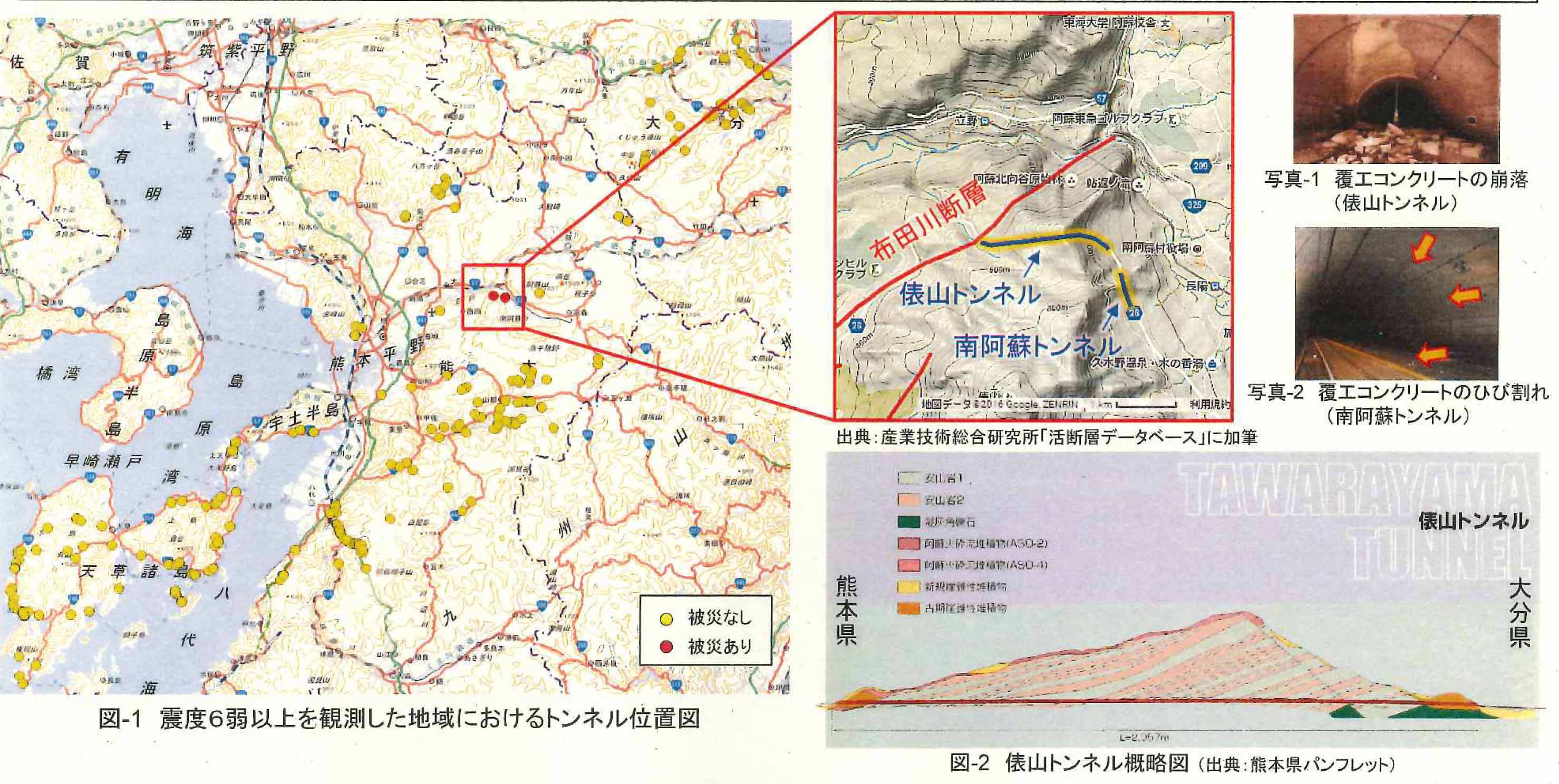 トンネル分野については、最も大きな被害を受けた俵山トンネルでも、トンネル空間自体が閉塞するという致命的な崩壊はなかった。一方で、今回の崩落個所は、極端な地山の不良箇所であることを過去の建設時の記録などから確認できている。これを踏まえて、覆工の補強などを重点的に行うとともに、山岳トンネルの耐震の観点からの配慮事項の明確化を図っていく。具体的には①計画・調査段階において活断層の把握に努める、②設計段階や施工段階において、特殊条件(断層・破砕帯や地質の剛性が急変する箇所等で極端な地山の不良箇所や偏圧を受ける地形などを指す)を有する区間は十分な支保構造を構築する、③維持管理段階においては、特殊条件が存在し、定期点検で覆工に変状(主に外力を要因とした変状が対象。地山条件が影響している場合が多い)が見られた場合、変状の原因および進行状況を踏まえて補強を含めた措置を検討する――など。
