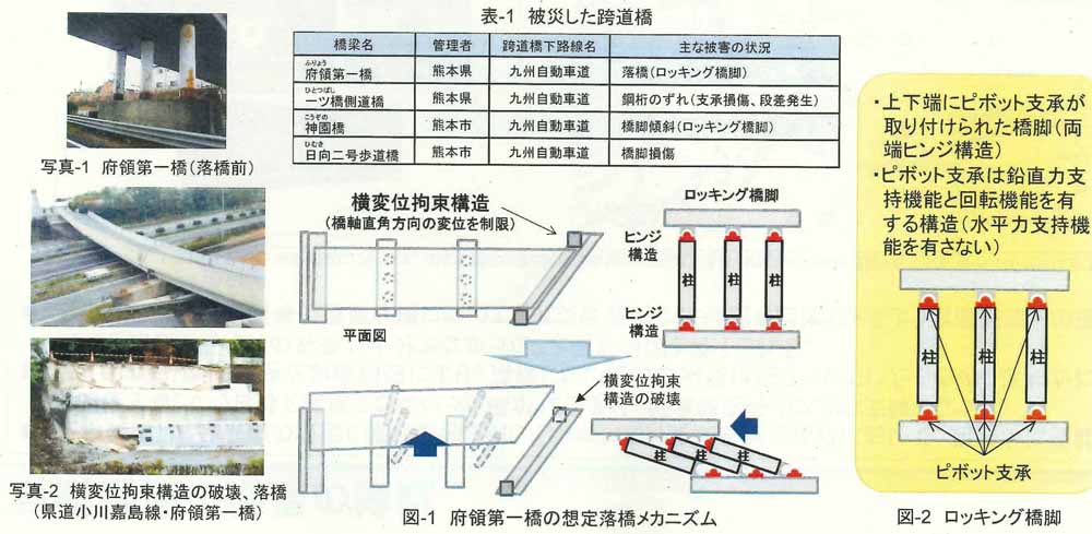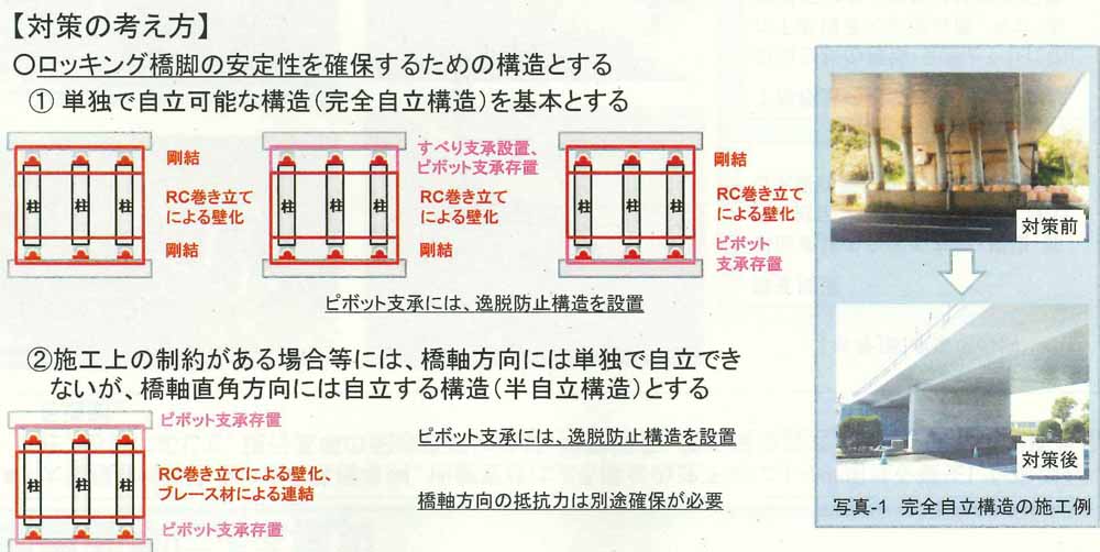一部で落橋したロッキング橋脚を有する橋梁については、橋脚全体をRCで巻き立てて壁化し上下部も剛結する手法、上部もしくは下部を剛結し、一方の支承だけを存置する完全自立構造を基本として耐震補強していくことが決められた。但し高速道路を跨ぐ個所にあるため施工上の著しい制約も見られることから、次善策として橋脚全体をRC巻き立てかブレース材によって連結する一方、上下端のピポット支承は逸脱防止構造を設けた上で存置する手法を示した。これは橋軸方向には単独で自立できないが、橋軸直角方向には自立する「半自立構造」と言えるもの。橋軸方向の抵抗力は別途確保が必要となる。
