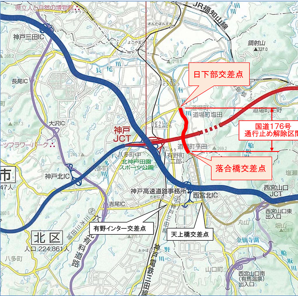 西日本高速道路は、新名神有馬川橋鋼桁の落下事故に伴い、通行止めを余儀なくされていた国道176号落合橋交差点~日下部交差点(神戸市北区道場町)について、7月9日午前0時に通行止めを解除すると発表した。