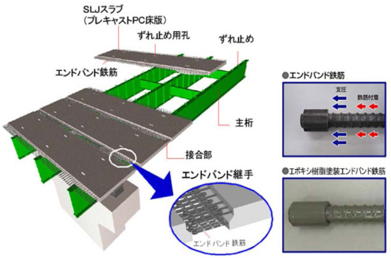 「SLJスラブ工法」は鉄筋の先端に鋼製エンドバンドを圧着したエンドバンド鉄筋を継手に採用したプレキャスト床版工法。床版の薄厚化、工期短縮化を実現し、西日本高速道路での施工をはじめとして、全国で 26 例の施工実績を有する。