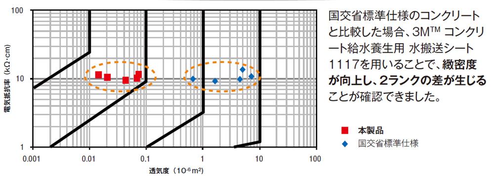 施工後のコンクリートは非常に緻密化されている。国交省標準仕様のコンクリートと比較した場合、同シートを用いることで「緻密度が向上し2ランクの差が生じることから遮水性や塩害・中性化への耐久性が向上している。「特に山間部などでは降雪時に凍結防止剤を散布するが、緻密なため水や塩分がコンクリート内部に浸透せず、塩害などによる損傷を抑制できる」(同社)としている。