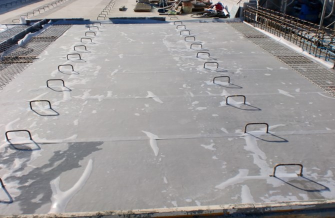 実際に施工した釜石道路向定内橋のPC床版打設工事では、同シートを用いて3か月間の給水養生を実施した。その結果、給水作業は1日1回で済んだ上、従来の養生マットと比べて給水量も1/10に削減できたほか、同シートで養生中の床版上面に750㌔の敷鉄板を敷設し、その上で重機を走行させても、給水養生が行えており、「コンクリート品質の向上だけでなく現場作業性の向上にも寄与できた」(同社)。