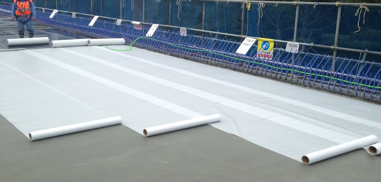 ②は、主に現場打ちコンクリート床版を対象とした、毛細管現象を利用して動力を用いず水を搬送できるシートだ。同シートはポリオレフィンを主材とした半透明シートに高精細表面技術による微細加工を施し、毛細管現象を起こせるようにしたもの。1梱包は1,000㍉幅×50㍍(約50平方㍍分)で約15㌔と軽く、シート厚も約0.4㍉と嵩張らないため、可搬性に優れており、ハンドリングし易い。シートは現場で形状に合わせて切断する(長さ方向調整はカッター、幅方向の調整は手で切断できる)ことが可能だ。また、シートは水を吸わないため、含水重量比を考慮すると従来用いられてきたマットに比較してさらに軽量と言える。