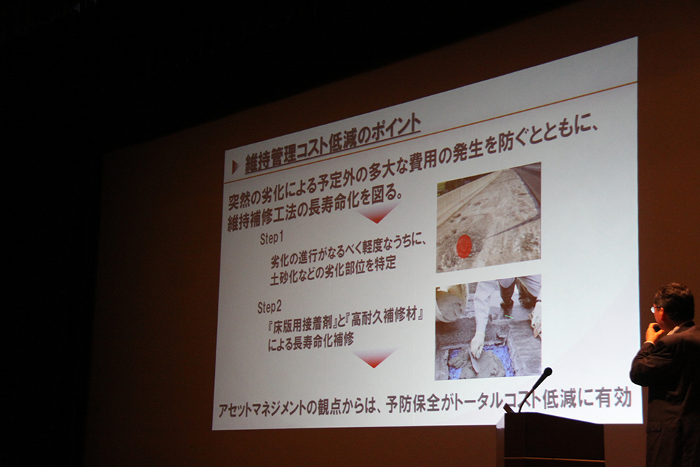 阿部忠教授(左写真)は、「定期点検における健全性判定区分Ⅳに対する補強策(床版)」と題して、疲労損傷だけでなく、凍害や塩害の影響で損傷した床版の状況や寿命推定なども詳しく説明した。また、超速硬繊維補強セメントモルタル(リフレモルセットSF)や、母材と断面修復材との接着剤(KSボンド)およびひび割れ含浸プライマー(KSプライマー)、上面増厚補強、各種埋設ジョイントなど実際の補修補強方法についても紹介した。