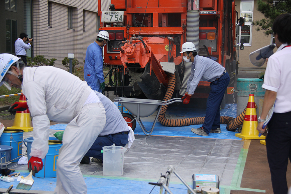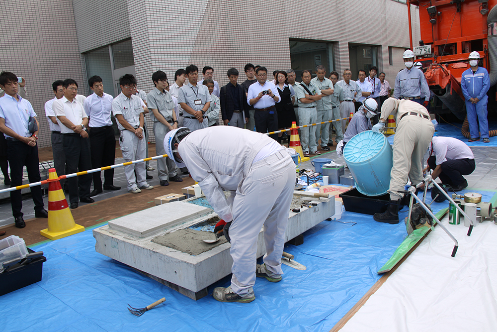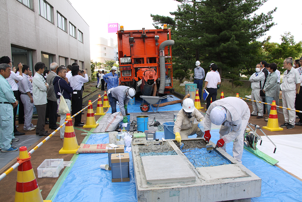 実演される補修工に熱い眼差しが向けられた/他の補修補強材も展示された