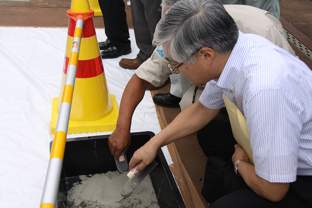 製造された断面修復材を実際にさわる出席者/模擬床版への接着剤の塗布