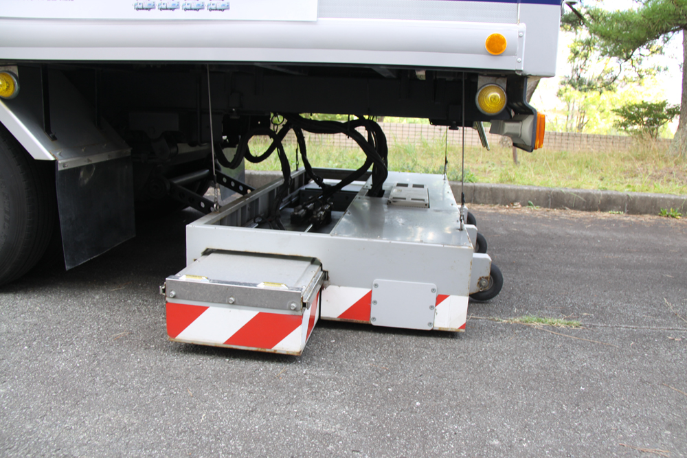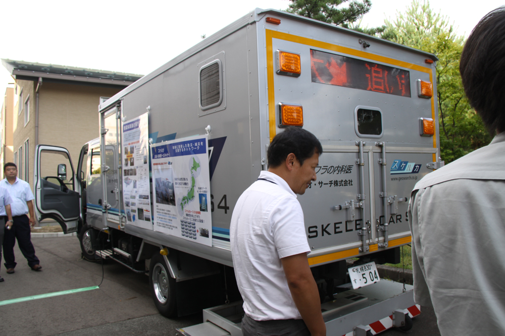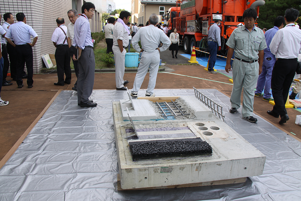 その後は鹿島道路や住友大阪セメントの技術者がビデオを用いて床版上面の断面修復工法に使う接着剤と補修剤の説明を行ったほか、建物の外部では、実際にケミカル工事が保有する大型モービル車を使って補修用のコンクリートやモルタルを製造し、模擬床版を用いて床版断面修復の実演を行ったほか、床版内部の空洞などを走行しながら調査できる非破壊電磁波レーダーを用いた点検車「スケルカ」を展示し、出席者に説明していた。加えて場外にも「ストランドシート」や「MM-JOINT DS型」、「グリッドメタル」など各種製品の展示スペースを設け、出席者に紹介していた。