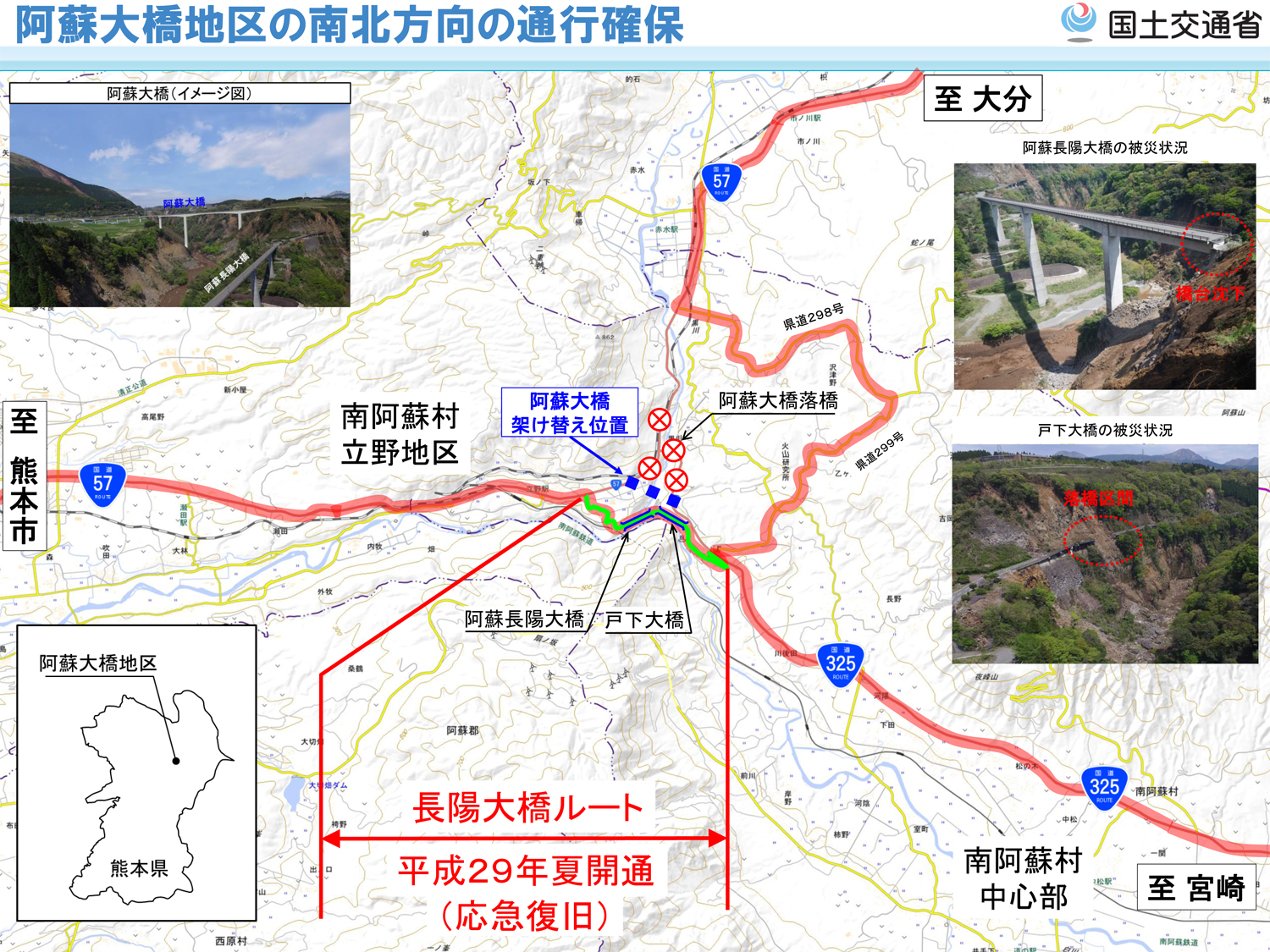 国土交通省は、熊本地震で被災した阿蘇長陽大橋と戸下大橋を含む長陽大橋ルート(約3㌔、南阿蘇村河陽~立野)について来年夏をめどに応急復旧すると発表した。これにより現在交通が寸断されている南阿蘇村の立野地区と中心部が再び結ばれることになる。