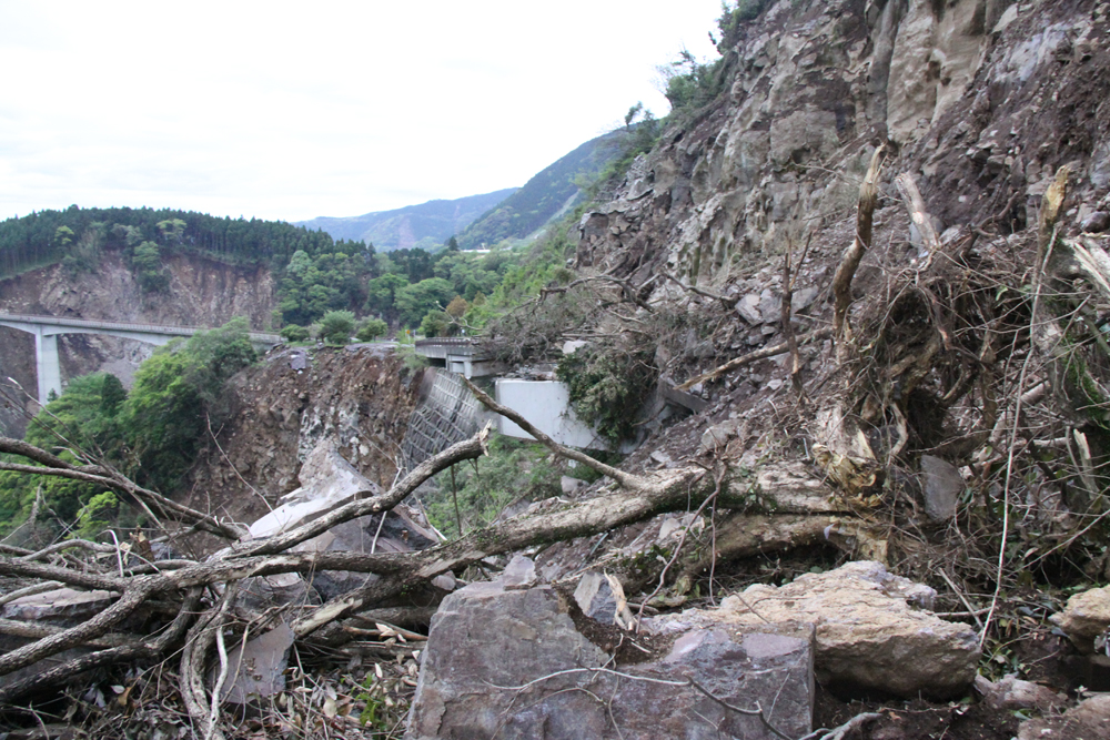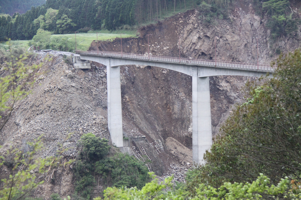 河陽側の戸下大橋は一部の桁が落橋している。そのため、応急復旧に当たっては仮橋などの架設も検討している。完全復旧は「山側に線形を少し追い込んで、法面の安全を確保した上で少量の切土を行う」(同)少々の線形変更を行った上で建設することを検討している。(井手迫瑞樹)