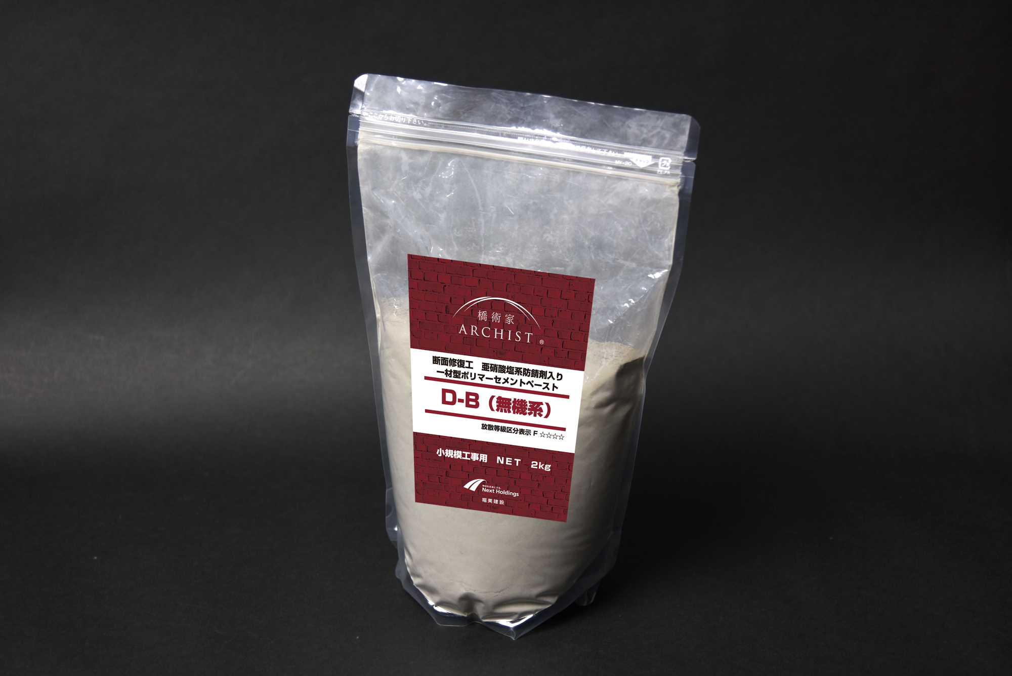 防錆剤「D-B(無機系)」は、亜硝酸塩系防錆材及びアクリル系粉末ポリマーを既調合したプレミックス材で、水を加えて練混ぜるだけでポリマーセメント系防錆ペーストとして使用できる。防錆剤は亜硝酸塩系なので「鉄筋の不動態皮膜形成を促し、長期にわたる防錆効果を発揮する」(同社)としている。