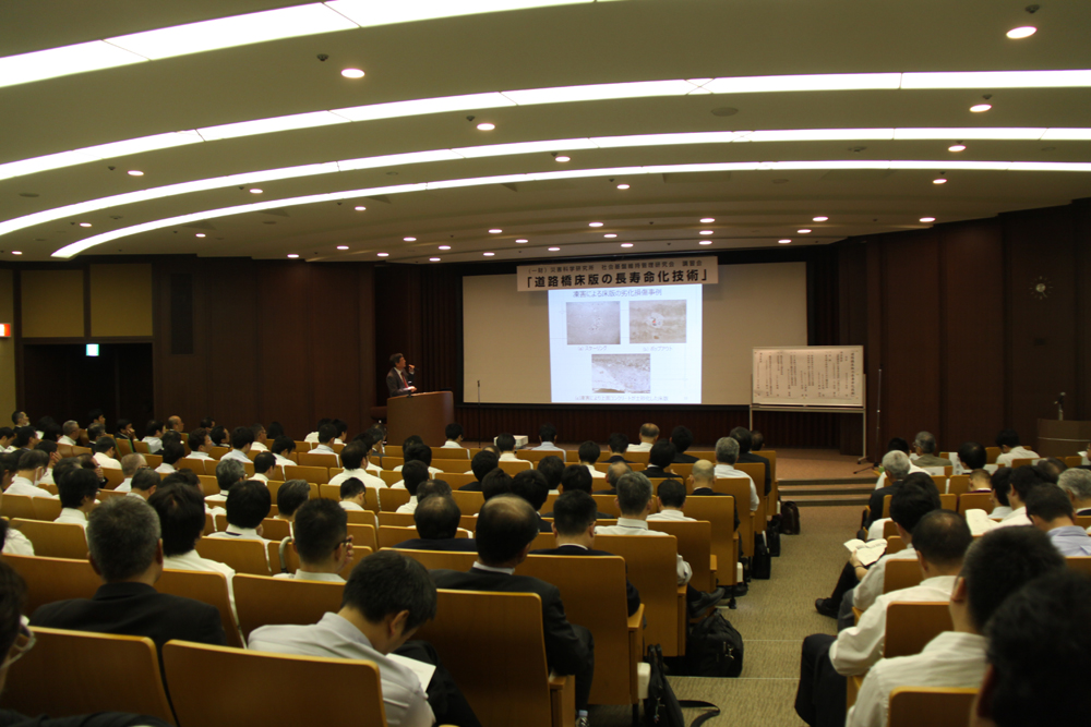 (一財)災害科学研究所 社会基盤維持管理研究会(松井繁之会長)は25日、大阪市の建設交流会で道路橋の維持管理講習会「道路橋床版の長寿命化技術」を開催した。同委員会が編集した森北出版刊「道路橋床版の長寿命化技術」をテキストに用いた講習会。200人の程度の参加予想に対し、230人が出席し、同分野に対する高い関心が露になった。