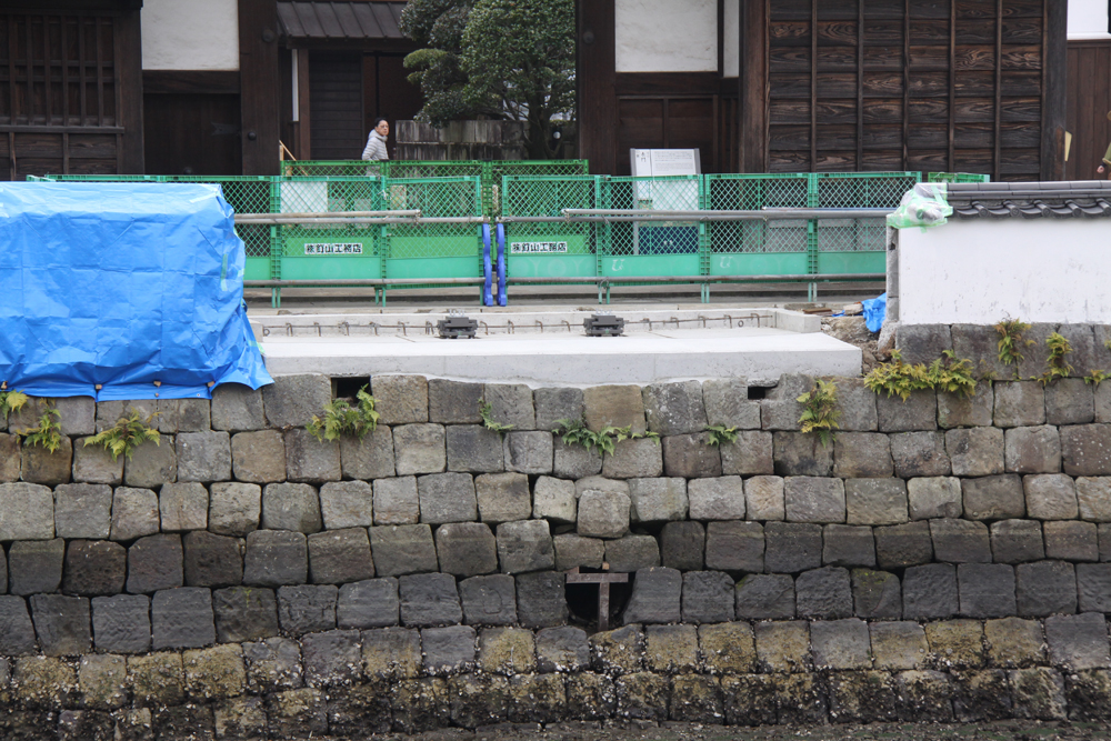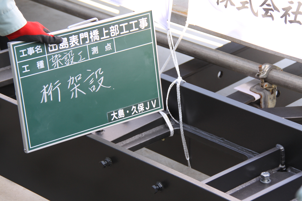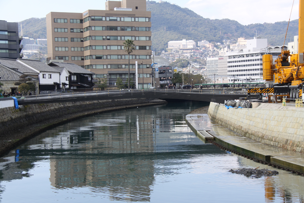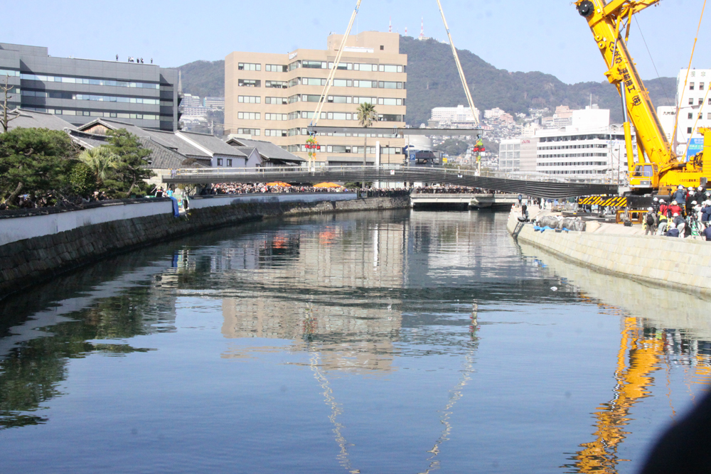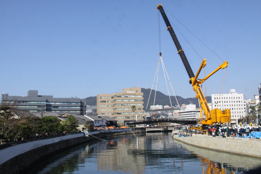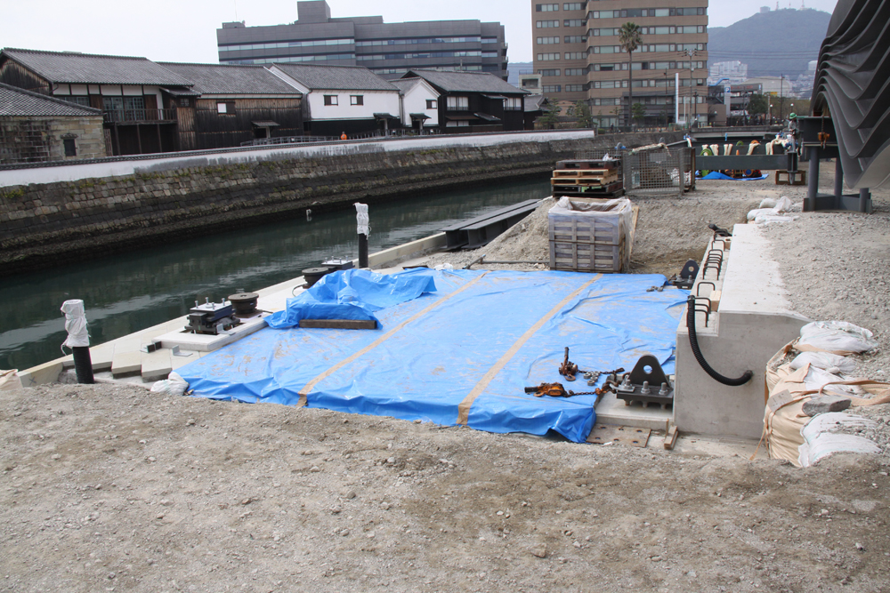 桁架設は550tトラッククレーンで吊上げて施工した。架設に際しては、桁を傷つけないため、通常の鋼製ワイヤーでなくナイロンスリングを使用し、桁を傷つけずかつ施工時の取り回しも楽になるようにした。また、出島側の橋台には(遺構の関係上)杭を打てず荷重を担保できないため、A2(江戸町側)橋台側に桁をアンカーでつなげ、P1側に据え付け、徐々にP2側に降ろしていった。構造的にもA2-P1間は5.2mしかなく、不等径間に見えるが、これは同区間でほぼ全ての荷重および耐震性能を担保するための措置で、同支間長がそのまま桁かかり長のようになるよう考慮して設計している。