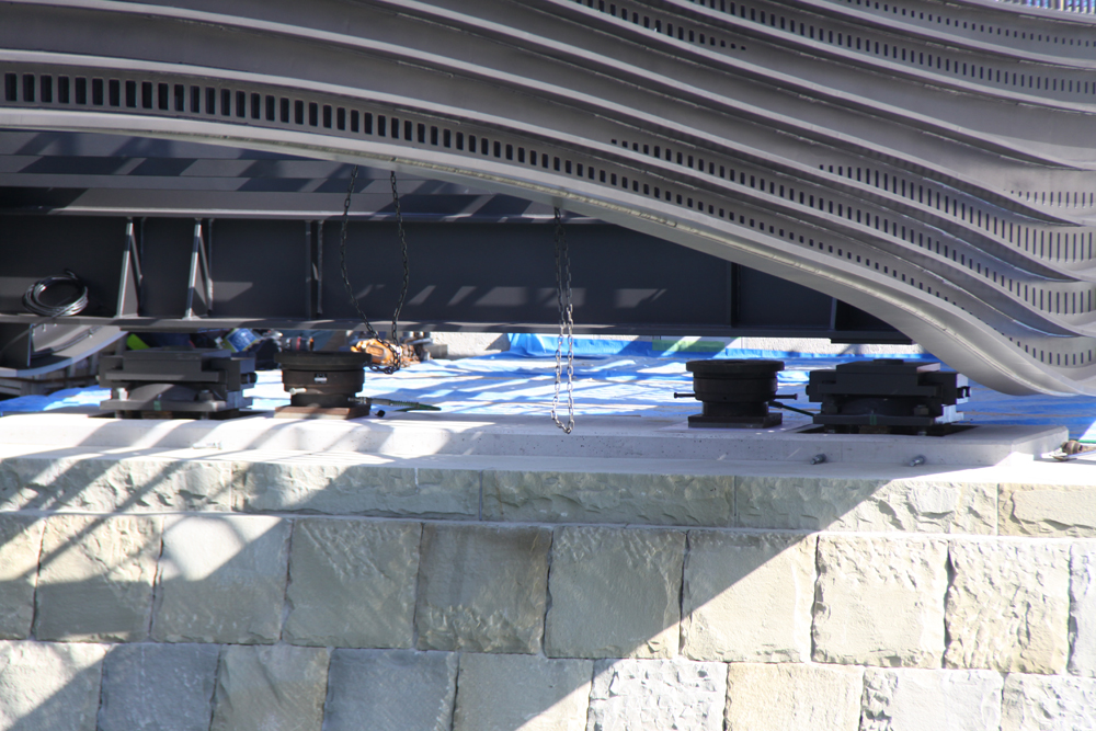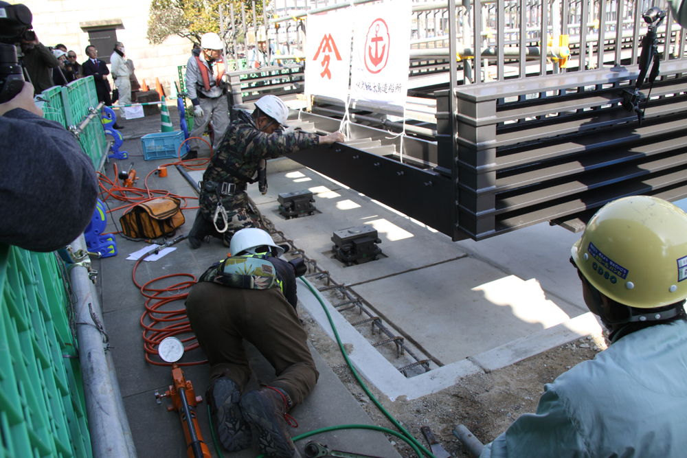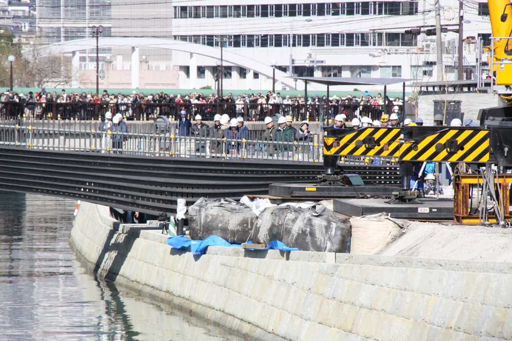 沢山の市民が注視した中で施工/P1支承の据え付け