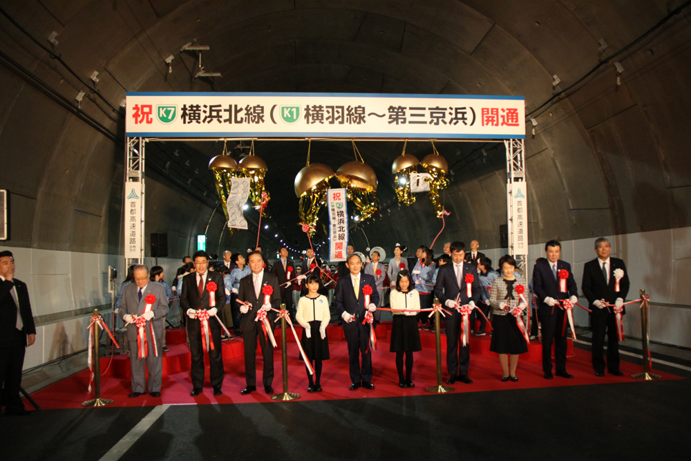 首都高速道路は18日午前10時から、横浜北線開通記念式典を横浜北トンネル内の特設会場で開催した。同式典には関係者など約400人が参加した。宮田年耕社長同式典の挨拶で「横羽線と第三京浜を繋ぐ横浜北線の開通に伴い新横浜駅周辺を中心としする横浜市北部と横浜港や羽田空港とのアクセスが向上する。このことにより物流の効率化や空港連絡バスの利便性の向上に寄与し、3月4日に開通した南本牧ふ頭出入り口や、現在建設中の横浜環状北西線と一体となって、陸海空の連携が深まり国際競争力の強化といった部分を期待できる」と述べた。また「環境面では延長の約7割をトンネルとして、周辺への負荷を最小限にした。周辺の生活道路の通過交通を誘引できることから安全面の向上も期待できる」と全体的な負荷軽減についても説明した。来賓としては、菅義偉内閣官房長官のほか、黒岩祐治神奈川県知事、林文子横浜市長などが出席し、祝辞を述べた。