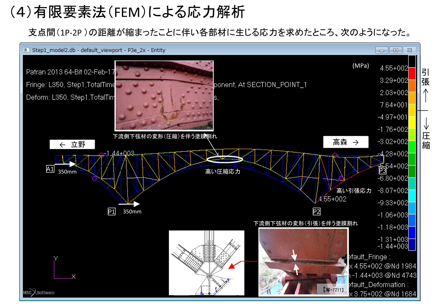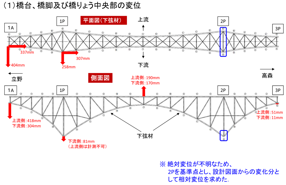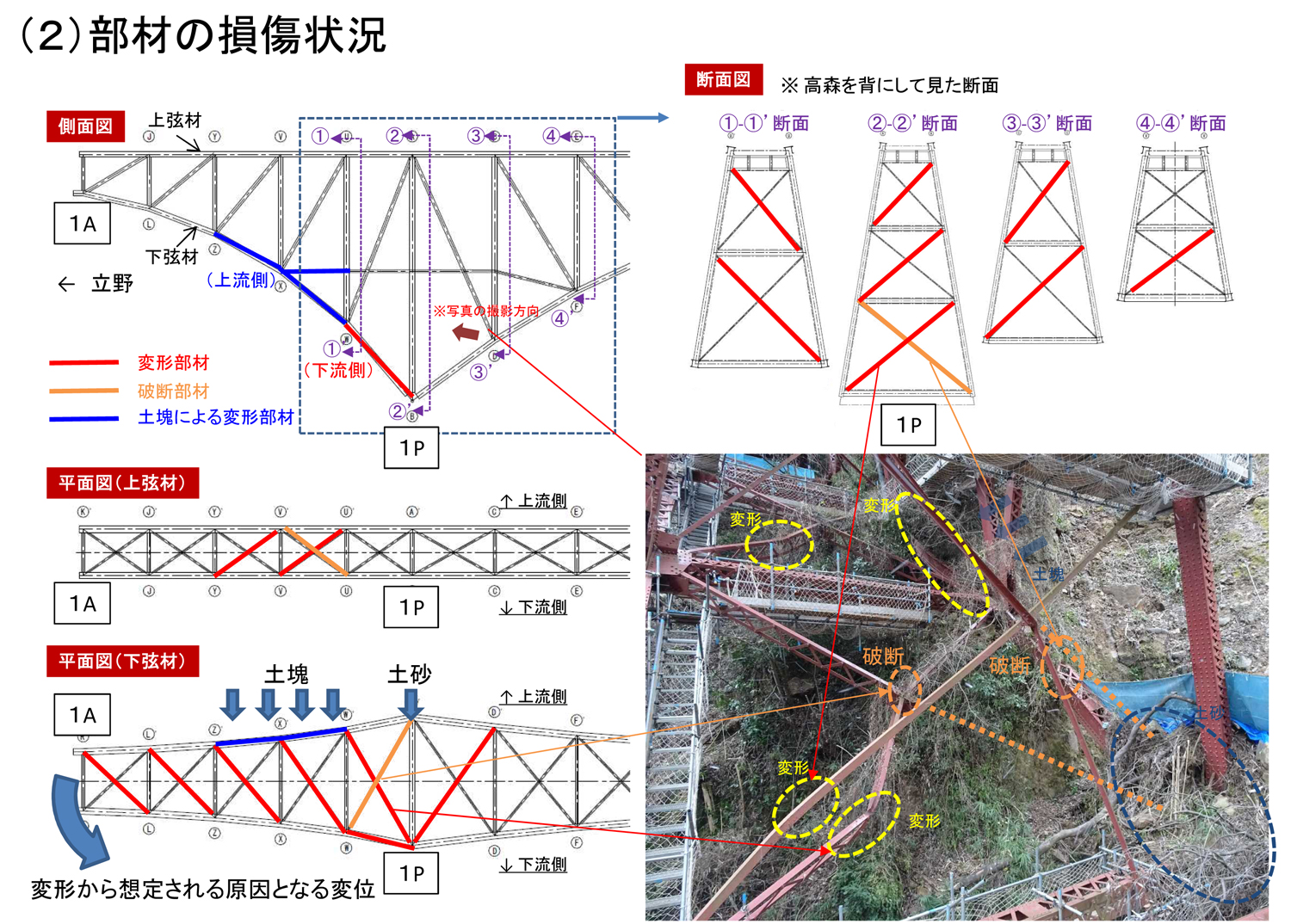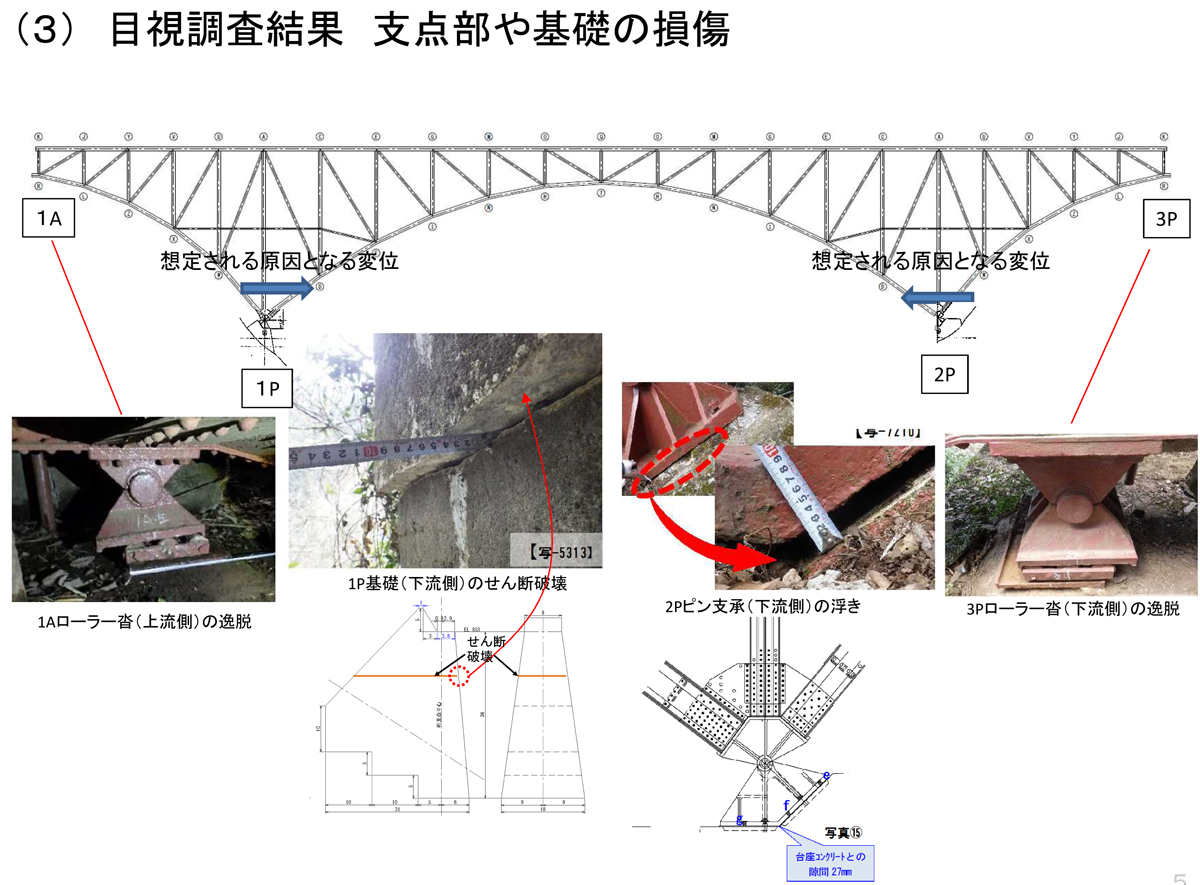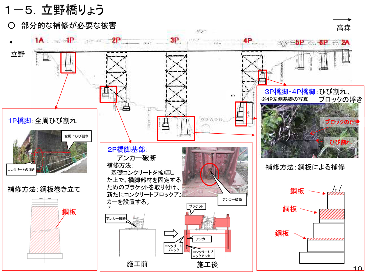 立野橋りょう(大正13年に供用されたトレッスル橋脚を有する鋼プレートガーダー橋)については、1P橋脚(コンクリート形式)では全周ひび割れ、2P橋脚基部(トレッスル橋脚)では一部でアンカー破断、3Pおよび4P橋脚(トレッスル橋脚)ではトレッスル橋脚基礎のひび割れ、ブロックの浮きが確認された。その復旧方法として1P橋脚は鋼板巻き立て、2P橋脚は基礎コンクリートを拡幅し、ブラケットを取り付けて新たに設置したコンクリートブロックにアンカーで繋げる補強方法、3P、4Pについては鋼板による補強をそれぞれ報告している。