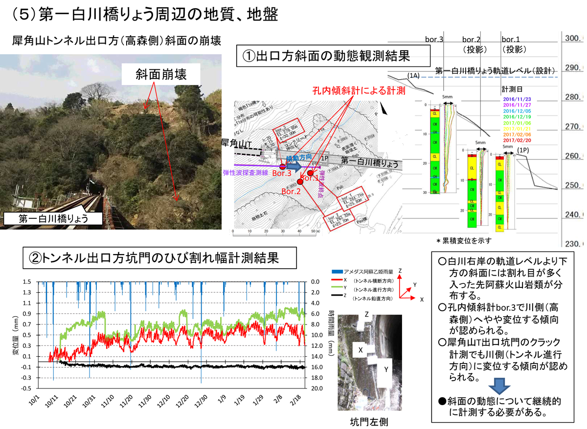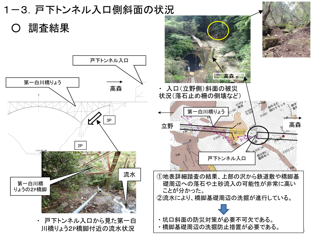 加えて同橋の基礎も起点側(犀角山トンネル出口)の下方斜面(橋りょう基礎部の斜面)は風化した凝灰角礫岩で構成され、割れ目が多く入っており、脆弱な岩質であることが確認された。また同橋の終点方(戸下トンネル入口)斜面では、沢の上流側では不安定な浮き石が多く、下流域では橋脚基礎周辺が表流水による浸食が進んでいることなどから、架け替えに際して下部工の補強も必要な状況だ。