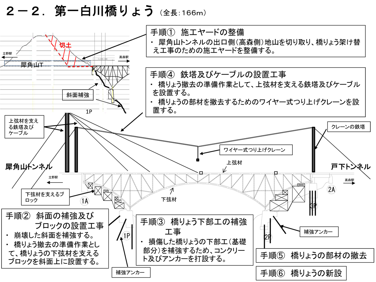 復旧手順は①犀角山トンネルの出口側地山を切り取り、橋梁架け替えのための施工ヤードを整備、②崩壊した斜面を補強し、既設橋撤去の準備とて下弦材を支えるブロックを斜面上に設置、③下部工を補強するためコンクリートおよびPSアンカーなどを打設、④既設橋撤去のための鉄塔およびケーブル、クレーンを設置した上で部材撤去、新設橋への架け替えを行う――いった内容が報告されている。