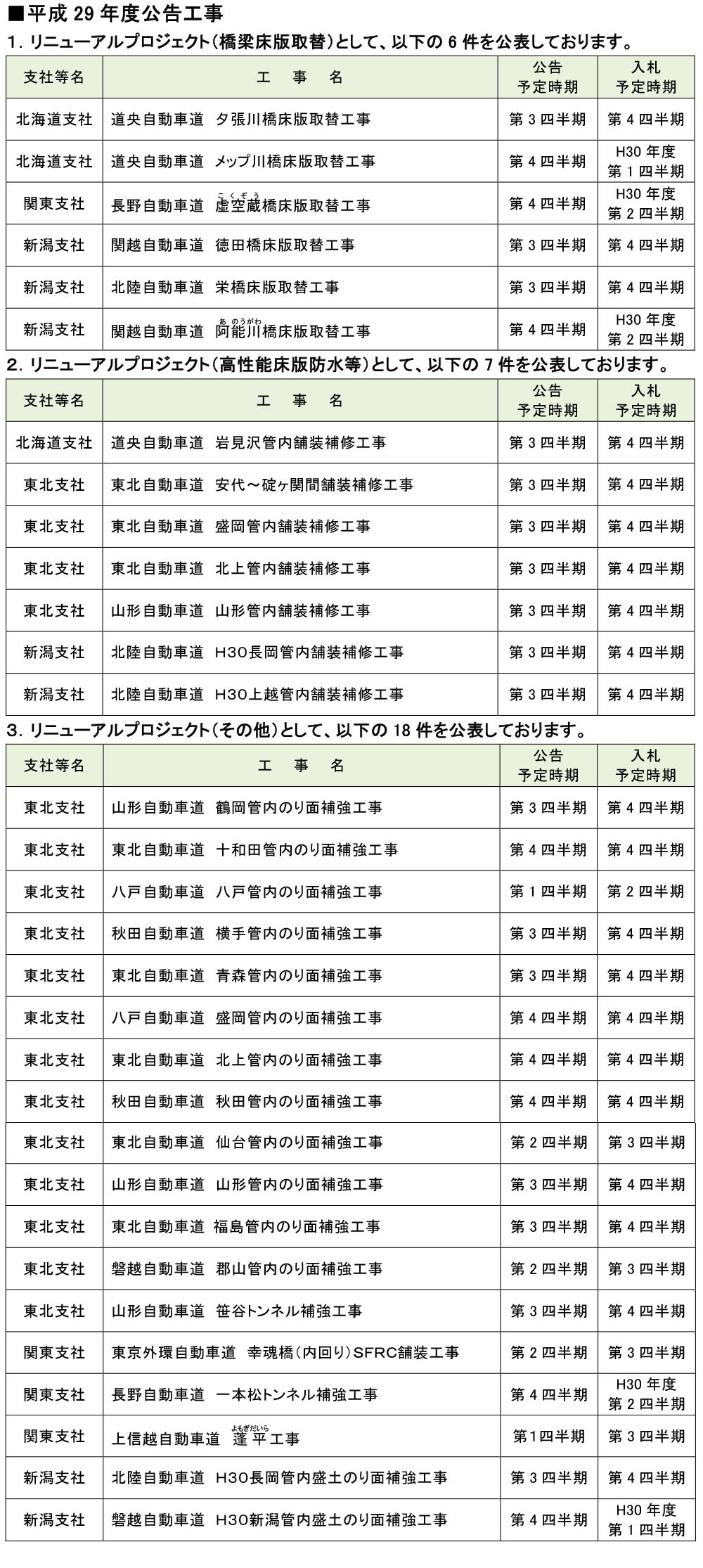 平成29年度公告工事一覧(NEXCO東日本提供)