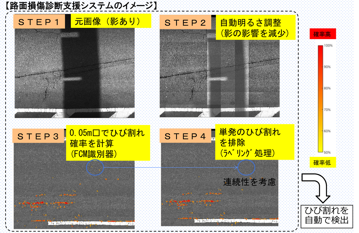 従来の手法は大量の画像を整理・処理するために時間とコストがかかり、また目視作業のため、判断結果に個人差が生じる――という課題があった。同システムを活用することで作業を大きく軽減できるほか、「現在は93%の一致率」(阪神高速技術)であるが、FCM識別器が学習を繰り返すことで、ひび割れ検出精度のさらなる向上も期待できる。また、画像から検出されたひび割れ、くぼみなどの損傷により路面性状の評価を行い、補修の可否を判断しているが、最終的にはそうした判断までを自動化できる「路面診断支援システム」の開発も進めていく。