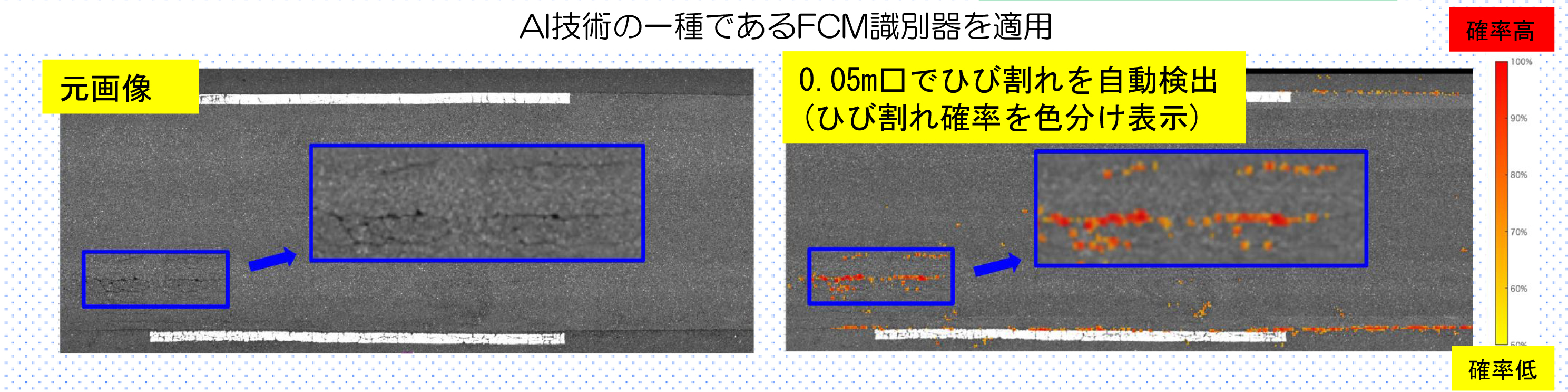 阪神高速技術とニチゾウテックおよび日立造船は、路面性状測定車「ドクターパト」に搭載されたラインスキャンカメラで撮影した大量の画像に対して、AI技術の1種であるFCM識別器を適用し、撮影画像から自動的にひび割れを検出する「ひび割れ検出システム」を開発した。同システムを活用することで作業時間を従来の1/5程度まで削減することを確認しており、今年度から本格的な運用を開始する。
