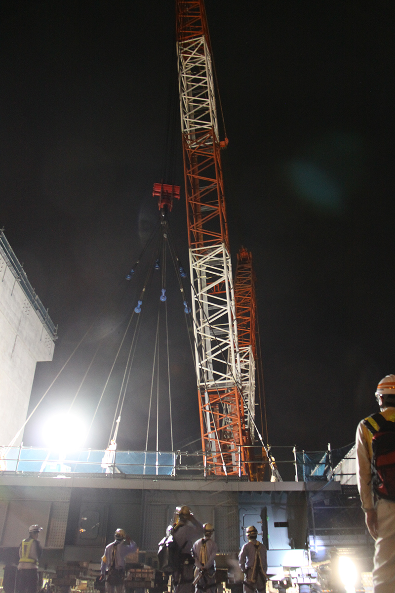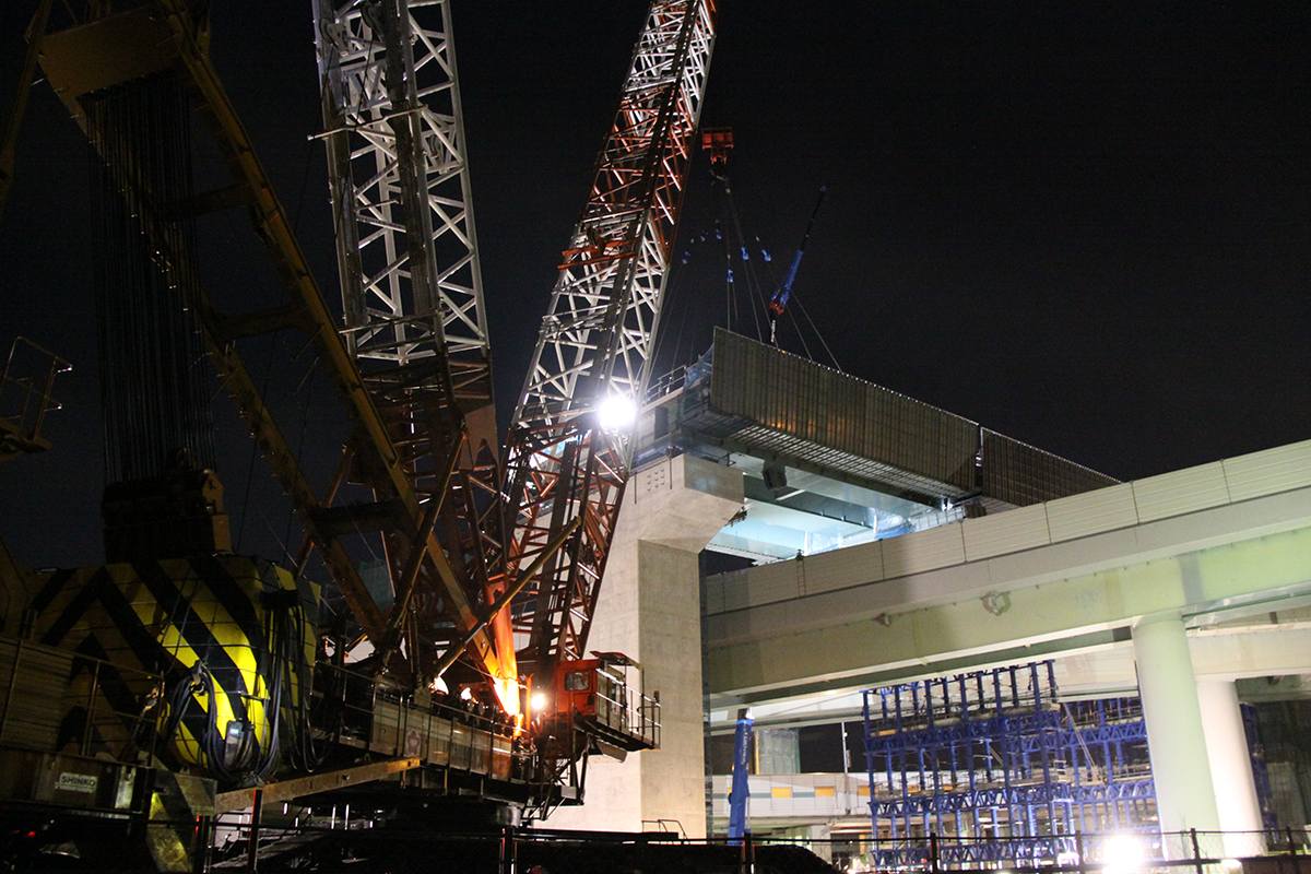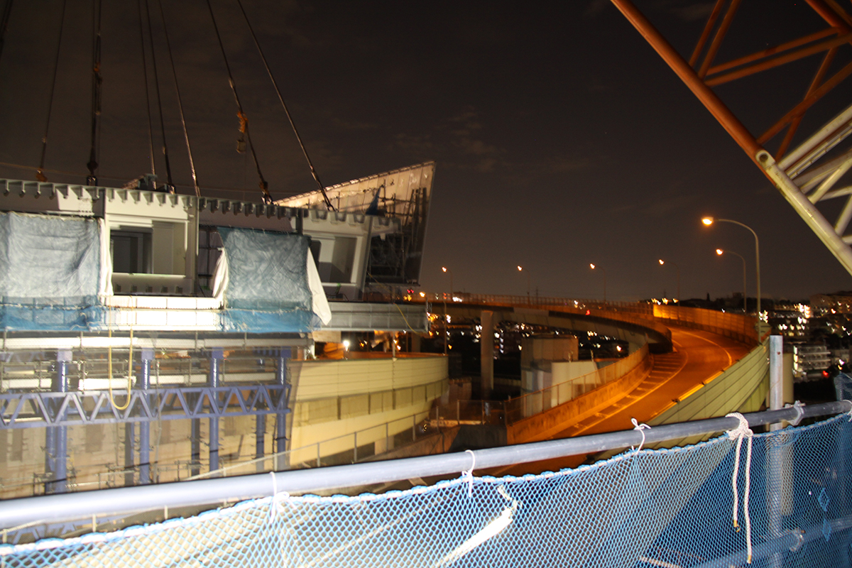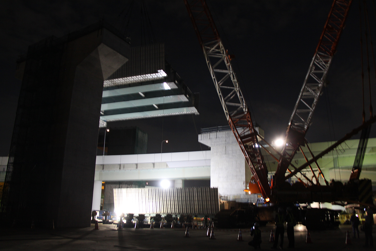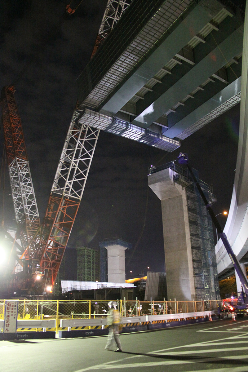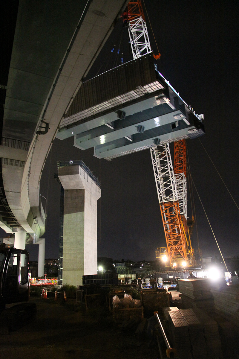 クローラークレーンはブーム長は60m、作業半径は38mで運用し、地組みヤードから供用中の一般道路を阻害しないように出来るだけヤード上、次いで通行止めしているCランプの上を180°旋回して桁を所定の位置まで運んだ。1回目の吊上げは22時10分過ぎに開始、2時間弱ほどで仮添接まで完了後、2回目の吊上げは0時35分に開始、3時頃には桁を所定の場所に据え付けた。