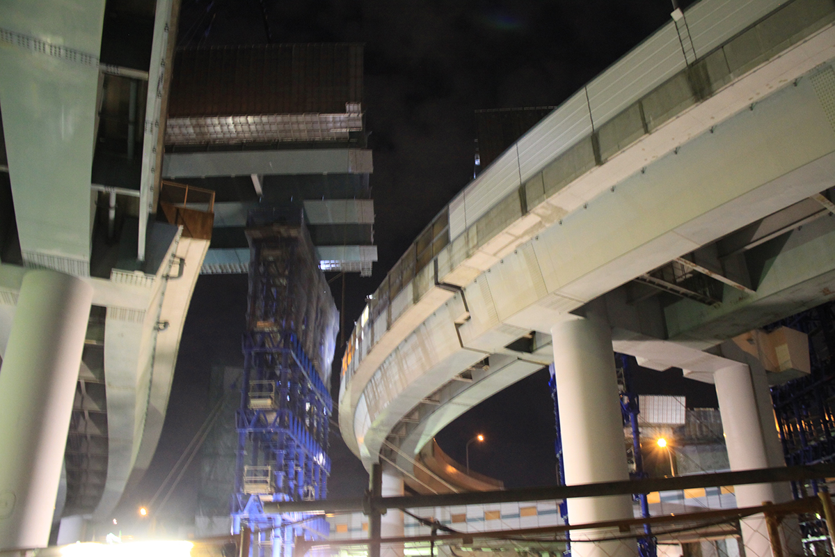 横浜青葉IC専用ランプ橋建設工事で40mの桁ブロックを夜間架設