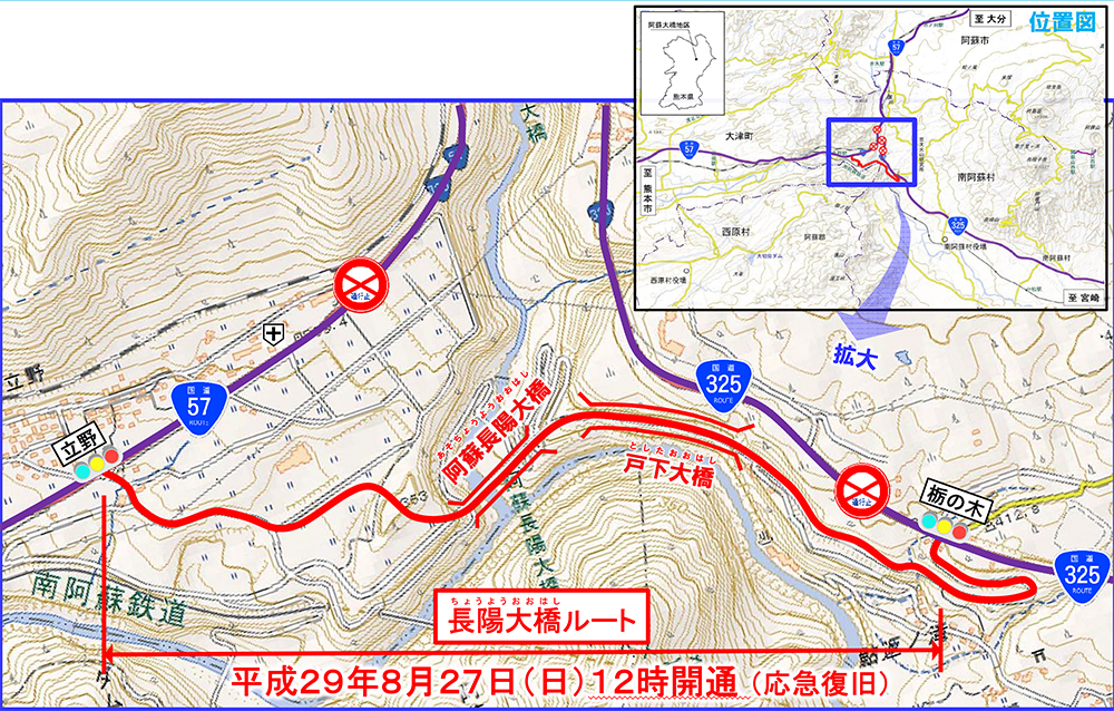 南阿蘇村の中心部と立野地区を結ぶ南北方向の通行が可能になったとともに、阿蘇大橋が完成するまでの間の代替ルートとして、阿蘇観光の玄関口としての経路も確保した。