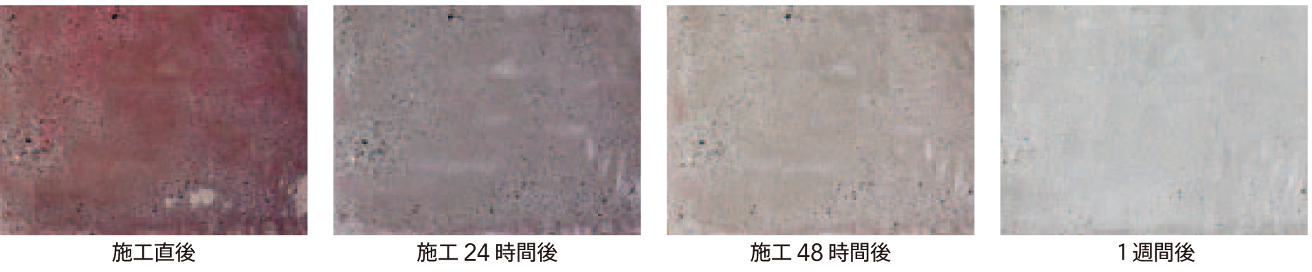 けい酸塩系表面含浸材では意匠性を変化させないことが特徴となっていたが、従来工法では施工現場で監督者による施工確認が難しいという欠点があった。新たな「RCガーデックス 土木用(1回塗り・退色性着色工法)」では、製品に付属する紫外線によって退色する「退色性着色剤」を現場でRCガーデックス 土木用に混合させることで、施工箇所がマゼンタ色で着色されるので、施工確認が容易となっている。着色された箇所は紫外線により約1~2週間で退色、消色するので、意匠性にも影響を与えない。ただし、紫外線が当たらない場所では消色しないので、散水による消色が必要だ。